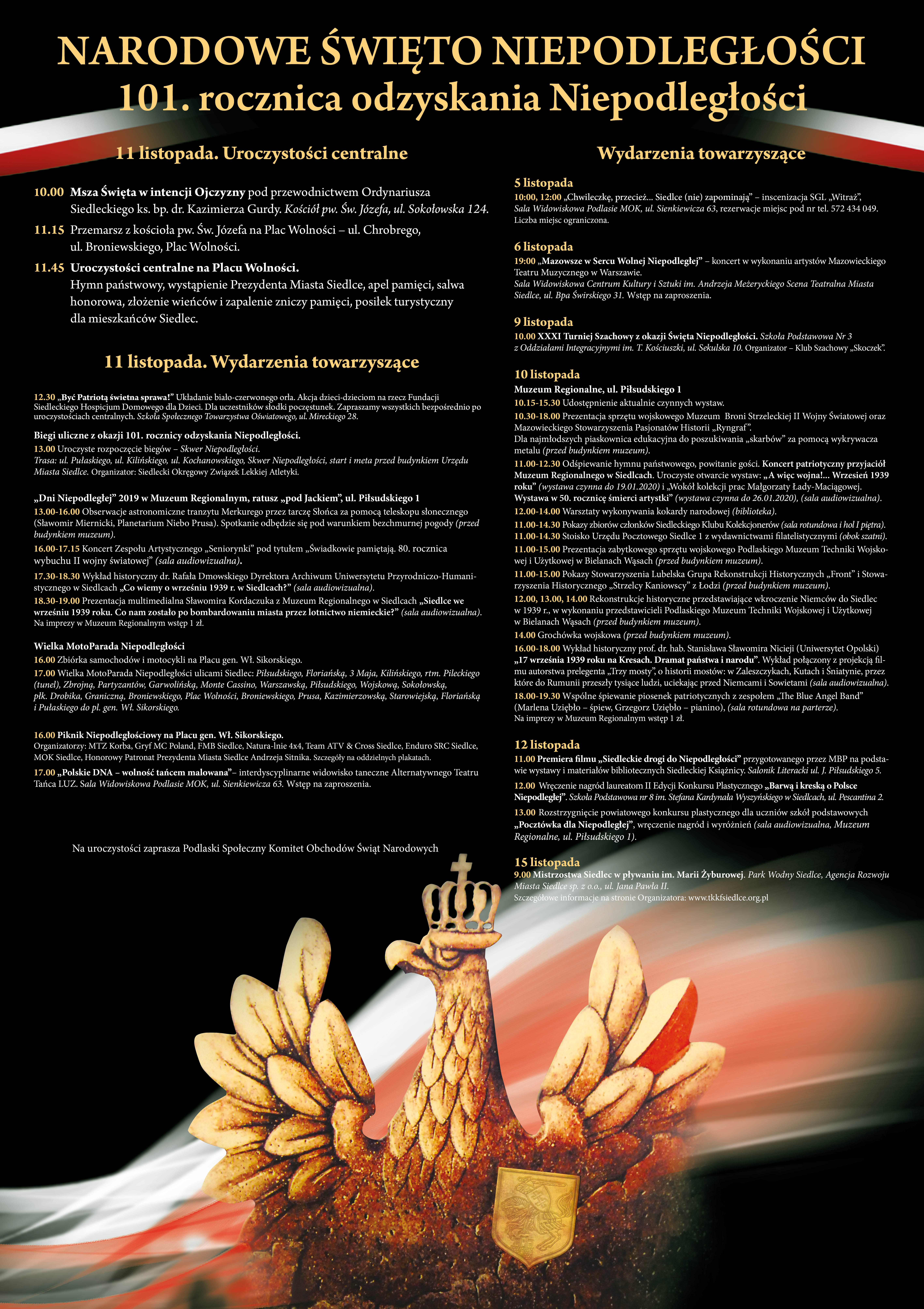 11.00-12.30 Odśpiewanie hymnu państwowego, powitanie gości. Koncert patriotyczny przyjaciół Muzeum Regionalnego w Siedlcach. Uroczyste otwarcie wystaw: „A więc wojna!... Wrzesień 1939 roku” (wystawa czynna do 19.01.2020) i „Wokół kolekcji prac Małgorzaty Łady-Maciągowej. Wystawa w 50. rocznicę śmierci artystki” (wystawa czynna do 26.01.2020), (sala audiowizualna).