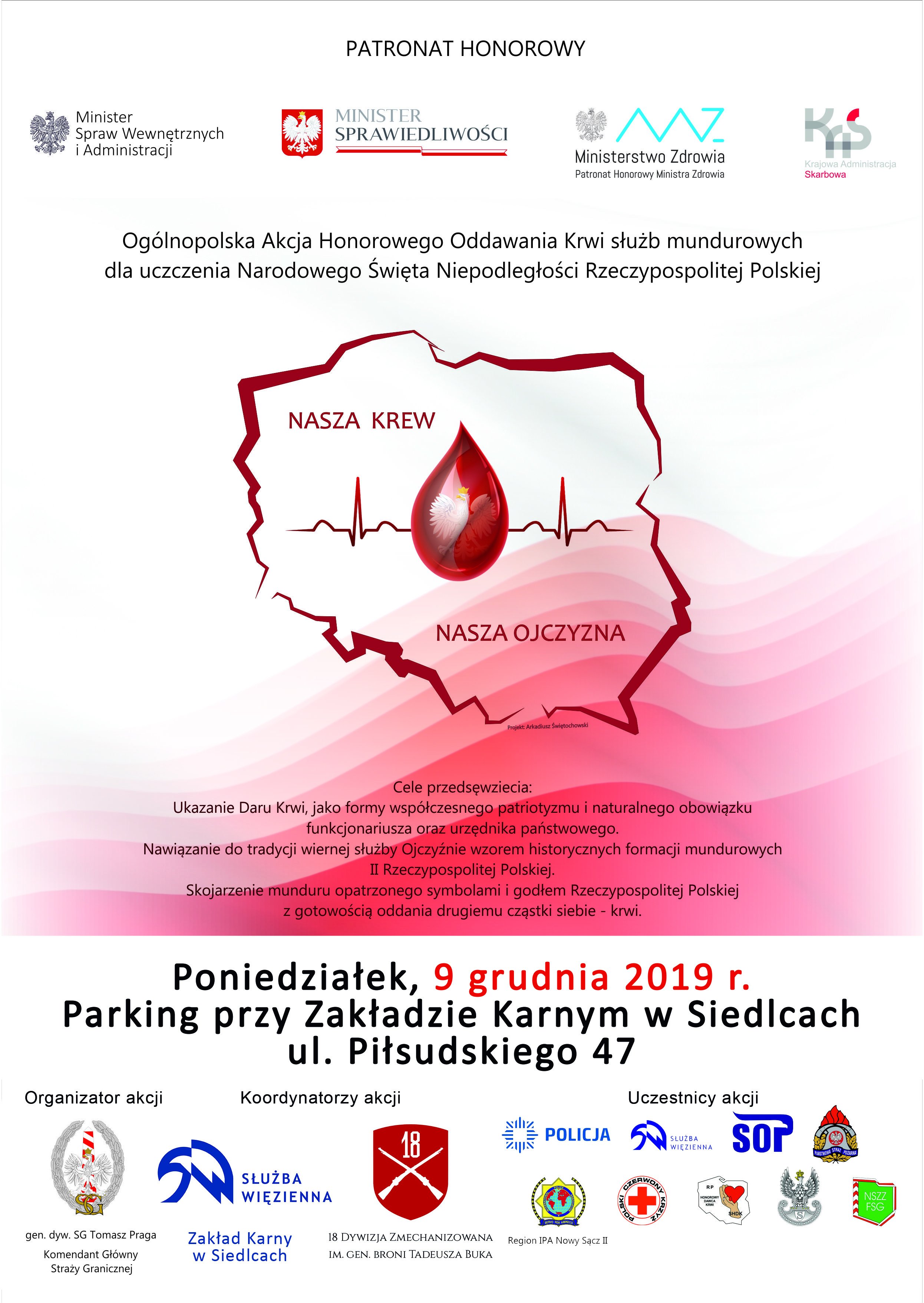Włączając się w obchody Narodowego Święta Niepodległości Zakład Karny w Siedlcach wraz z 18 Dywizją Zmechanizowaną im. gen. broni Tadeusza Buka koordynują lokalnie organizowaną w dniach 21 października do 20 grudnia 2019 r. ogólnopolską akcji krwiodawstwa służb mundurowych pod hasłem „NASZA KREW – NASZA OJCZYZNA”.