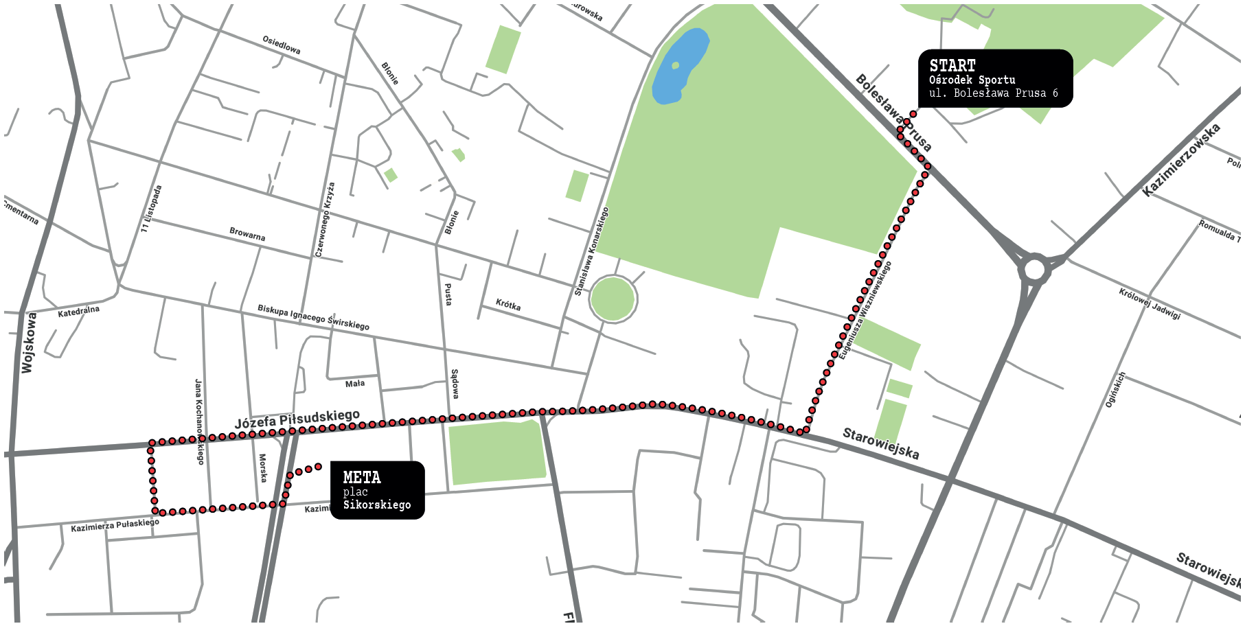 Trasa Biegu: ul. B. Prusa 6 – ul. Wiszniewskiego – ul. Starowiejska – ul. Piłsudskiego – skwer Niepodległości – ul. Pułaskiego – Plac gen. W. Sikorskiego.