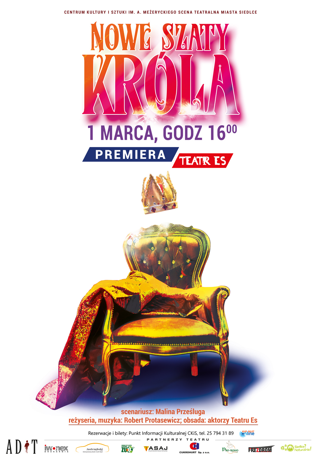 Historia dzieje się współcześnie, kiedy to po świecie, jak po wybiegu, paradują celebryci, a eksperci w dziedzinie mody i urody stają się guru dla mas. Takim nowoczesnym światem glamour zarządza król – mierny kreator własnego życia, który wewnętrzną pustkę, rozdzierającą samotność usiłuje przykryć coraz to bardziej szałowym ciuchem. Aż do absurdu, aż do okrzyku: „Król jest nagi!”. Opowieść tym smutniejsza, że aktualna. Ale pełni wigoru aktorzy Teatru Es nie pozwolą Wam się smucić ponad miarę, tym bardziej, że tekst sztuki okraszony jest wybornym humorem Prześlugi, a piosenki z muzyką Roberta Protasewicza, który jest reżyserem całości, nadają przedstawieniu lekkości.