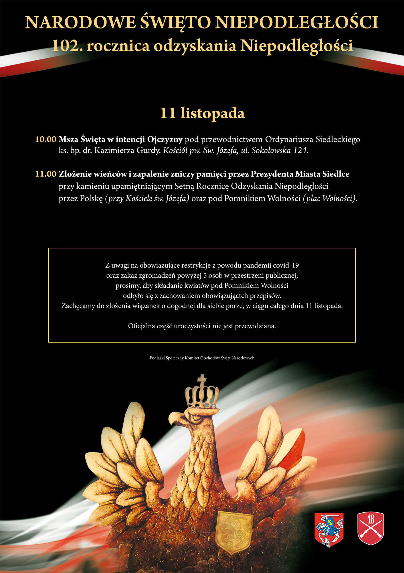Z uwagi na obowiązujące restrykcje z powodu pandemii covid-19 oraz zakaz zgromadzeń powyżej 5 osób w przestrzeni publicznej, prosimy, aby składanie kwiatów pod Pomnikiem Wolności odbyło się z zachowaniem obowiązująctch przepisów. Zachęcamy do złożenia wiązanek o dogodnej dla siebie porze, w ciągu całego dnia 11 listopada.