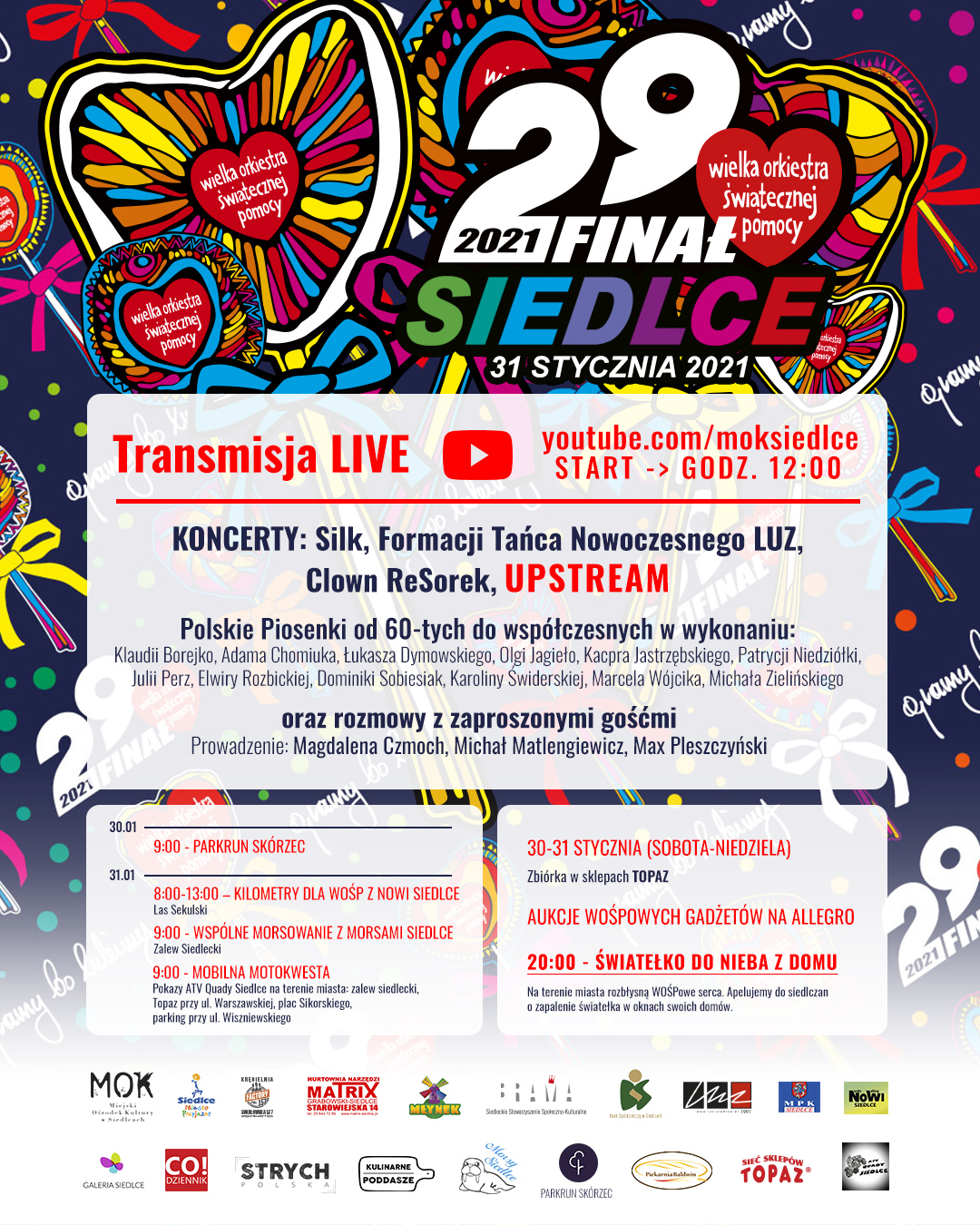 29. Finał Wielkiej Orkiestry Świątecznej Pomocy już 31 stycznia! Mimo trudnej sytuacji związanej z pandemią, jako Sztab, działający tradycyjnie przy Miejskim Ośrodku Kultury w Siedlcach, robiliśmy wszystko, aby Orkiestra mogła zagrać ponownie w naszym mieście.