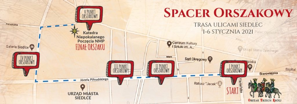 - Na tradycyjnej trasie Orszaku prowadzącej ulicą Piłsudskiego przez ulicę Wojskową i dale do siedleckiej katedry, w miejscach gdzie dawniej odbywały się sceny orszakowe, rozstawimy tablice orszakowe z ciekawymi informacjami o historii Orszaku i historii Zbawienia. Zajadą się też tam zadania i pytania do krzyżówki orszakowej, która zamieszczona będzie w mapce orszakowej (mapkę można pobrać we własnej parafii lub wydrukować ze strony Organizatora – patrz punkt 7 – Mapka Orszakowa). Każdy indywidualnie bądź w gronie najbliższych będzie mógł odbyć osobisty Orszak na wzór Trzech Króli.
