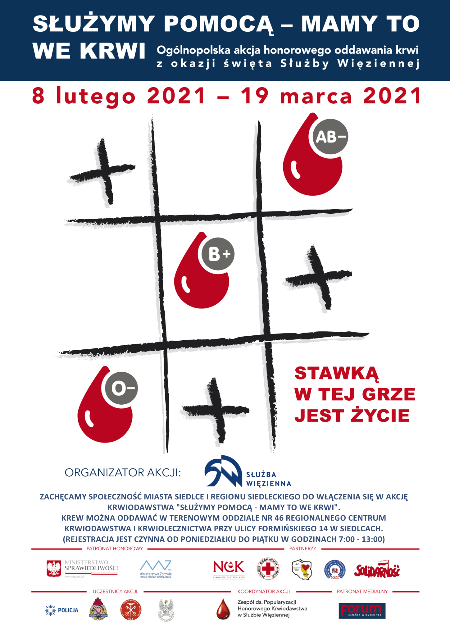 Ogólnopolska akcja krwiodawstwa została objęta honorowym patronatem Ministerstwa Sprawiedliwości i Ministerstwa Zdrowia. Przedsięwzięcie ma na celu pomoc w ratowaniu życia ludzkiego poprzez łagodzenie deficytu krwi w placówkach leczniczych oraz bankach krwi. Tegoroczna zbiórka krwi rozpoczyna się 8 lutego, w dniu święta Służby Więziennej i potrwa do 19 marca.