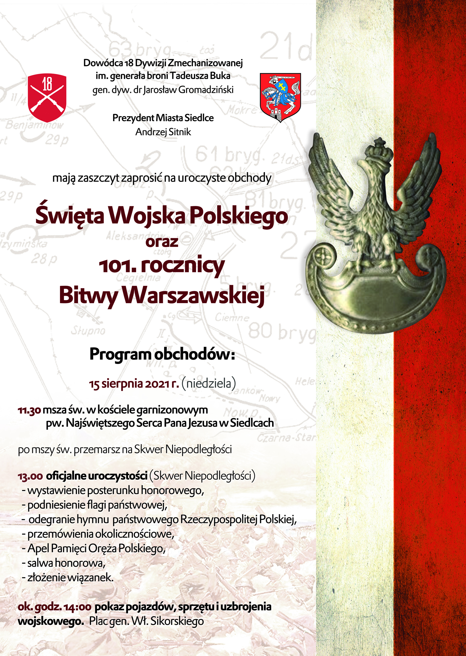 Dowódca 18 Dywizji Zmechanizowanej im. generała broni Tadeusza Buka - gen. dyw. dr Jarosław Gromadziński oraz Prezydent Miasta Siedlce - Andrzej Sitnik, mają zaszczyt zaprosić na obchody Święta Wojska Polskiego oraz 101. Rocznicy Bitwy Warszawskiej