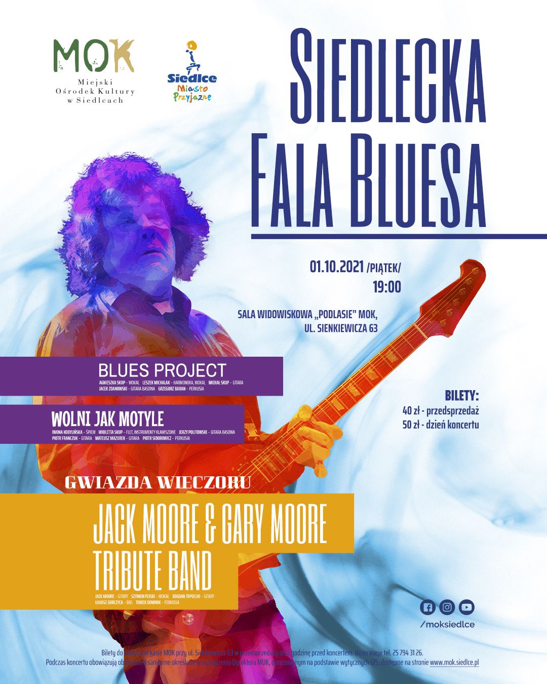 Siedlecka Fala Bluesa to już obowiązkowa pozycja w jesiennym kalendarzu wydarzeń Miejskiego Ośrodka Kultury w Siedlcach. Co roku fani dobrej bluesowej muzyki mają okazję wysłuchać w sali „Podlasie” niezwykłych koncertów w wykonaniu siedleckich zespołów i zaproszonych gwiazd. Podczas tegorocznej edycji wystąpią: Wolni Jak Motyle, Blues Project oraz Gary Moore Tribute Band feat. Jack Moore.
