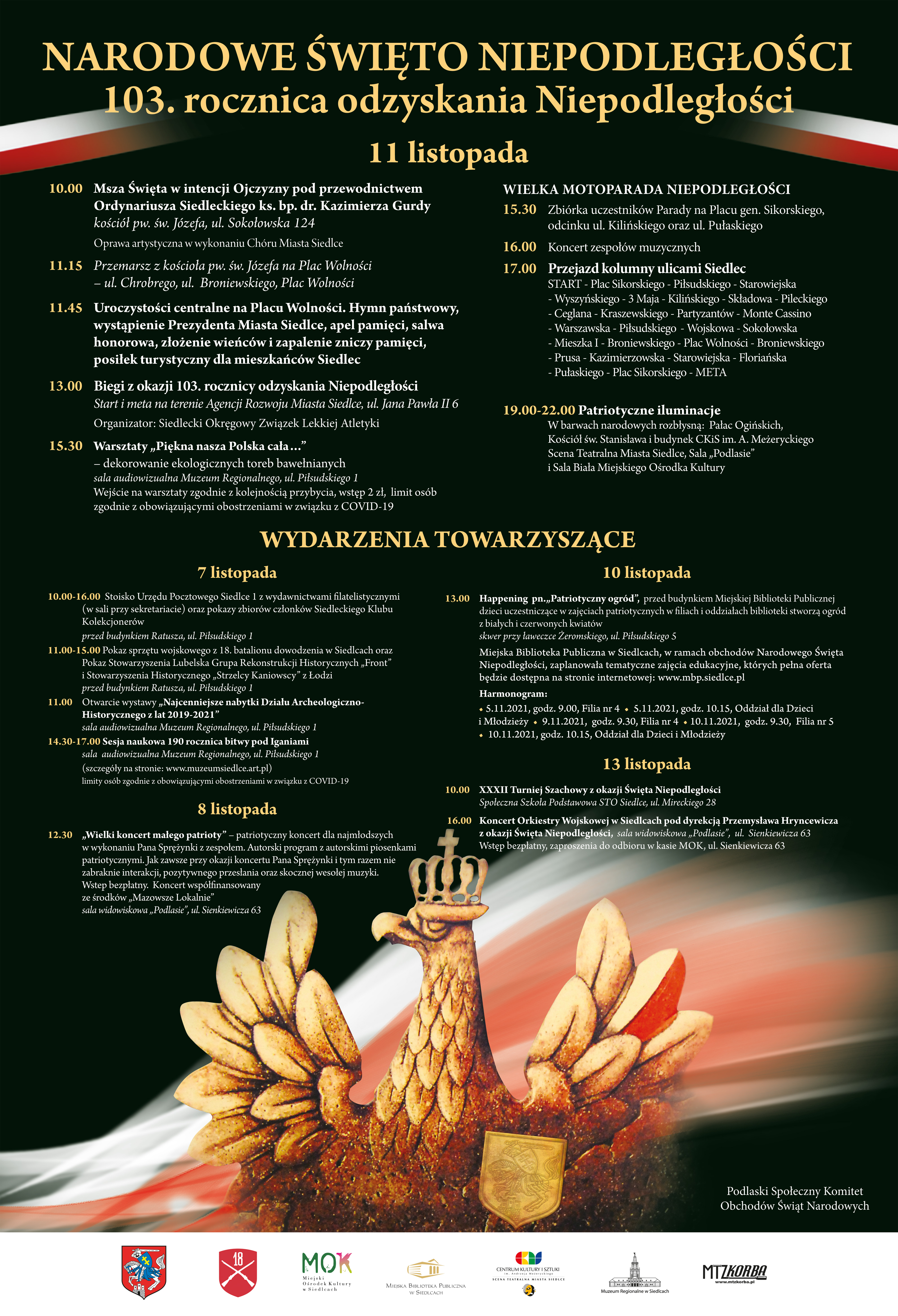 Patriotyczne iluminacje w barwach narodowych rozbłysną: Pałac Ogińskich, Kościół św. Stanisława i budynek CKiS im. A. Meżeryckiego Scena Teatralna Miasta Siedlce, Sala „Podlasie” i Sala Biała Miejskiego Ośrodka Kultury
