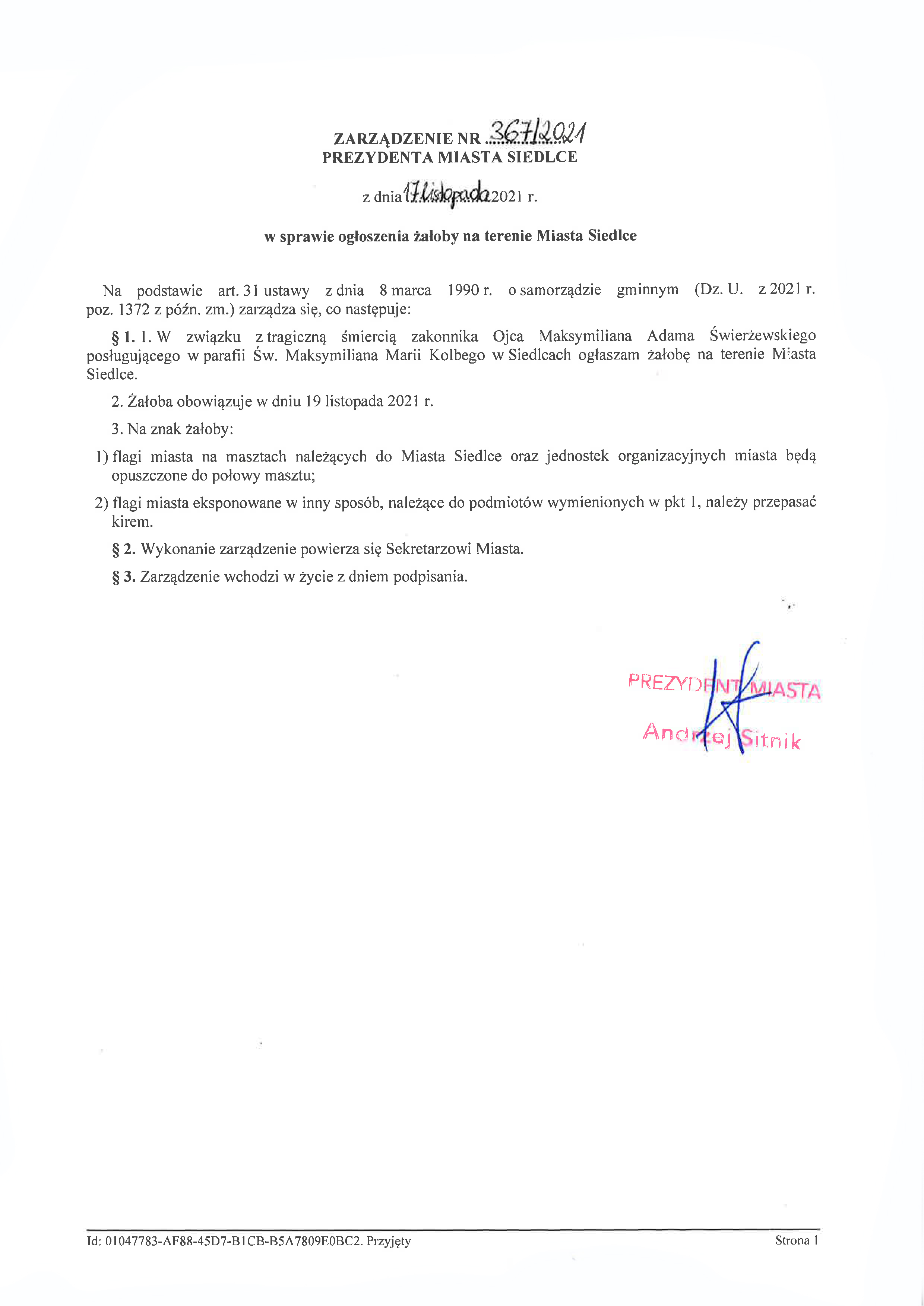 W związku z tragiczną śmiercią Franciszkanina O. Maksymiliana Adama Świerżewskiego, posługującego w parafii Św. Maksymiliana Marii Kolbego w Siedlcach, Prezydent Miasta Siedlce Andrzej Sitnik ogłosił 19 listopada 2021 r. żałobę na terenie miasta Siedlce.
