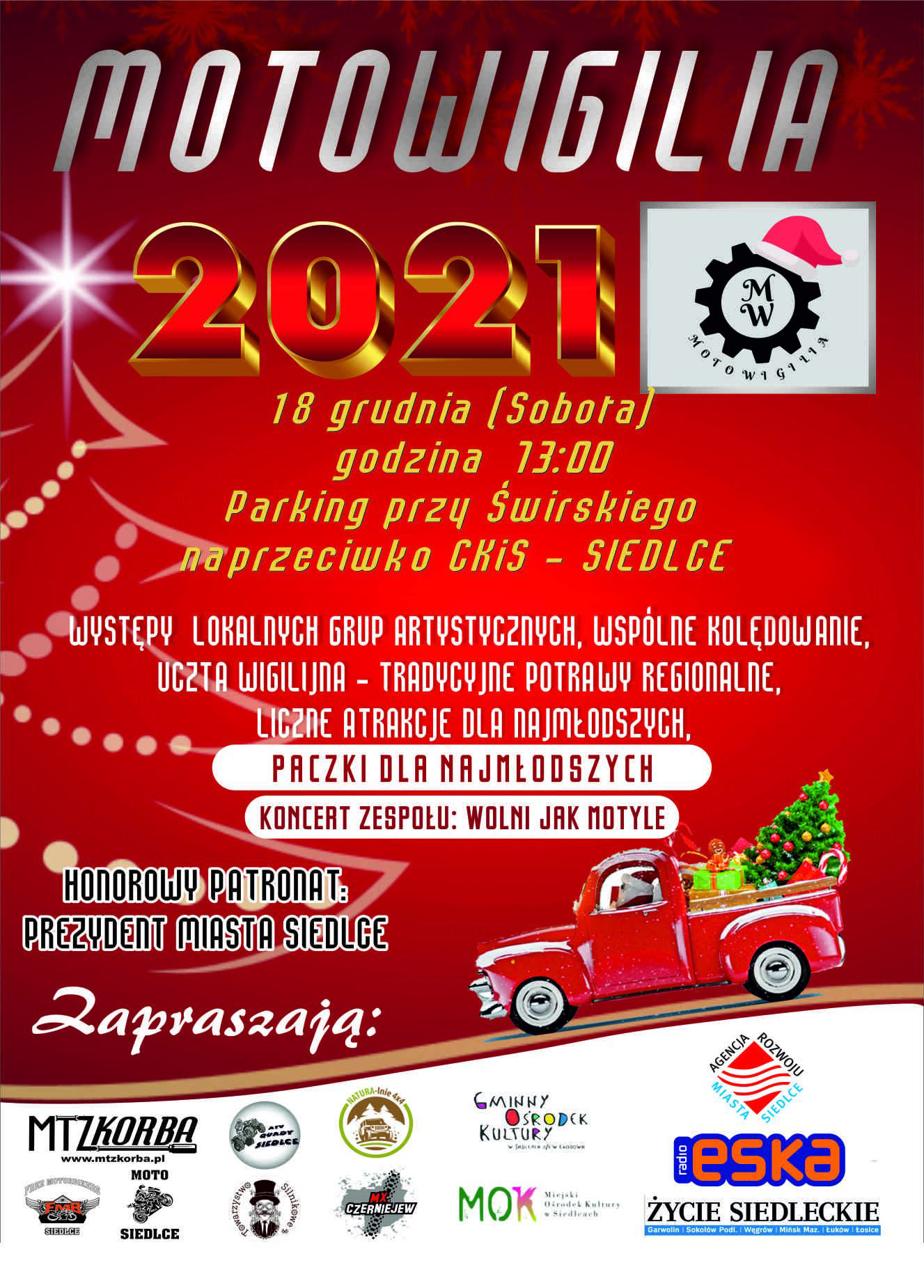 Zapraszamy 18 grudnia na kolejną już edycję MOTOWIGILII, która w tym roku odbędzie się na parkingu przy ul. Świrskiego, naprzeciwko Centrum Kultury i Sztuki w Siedlcach.