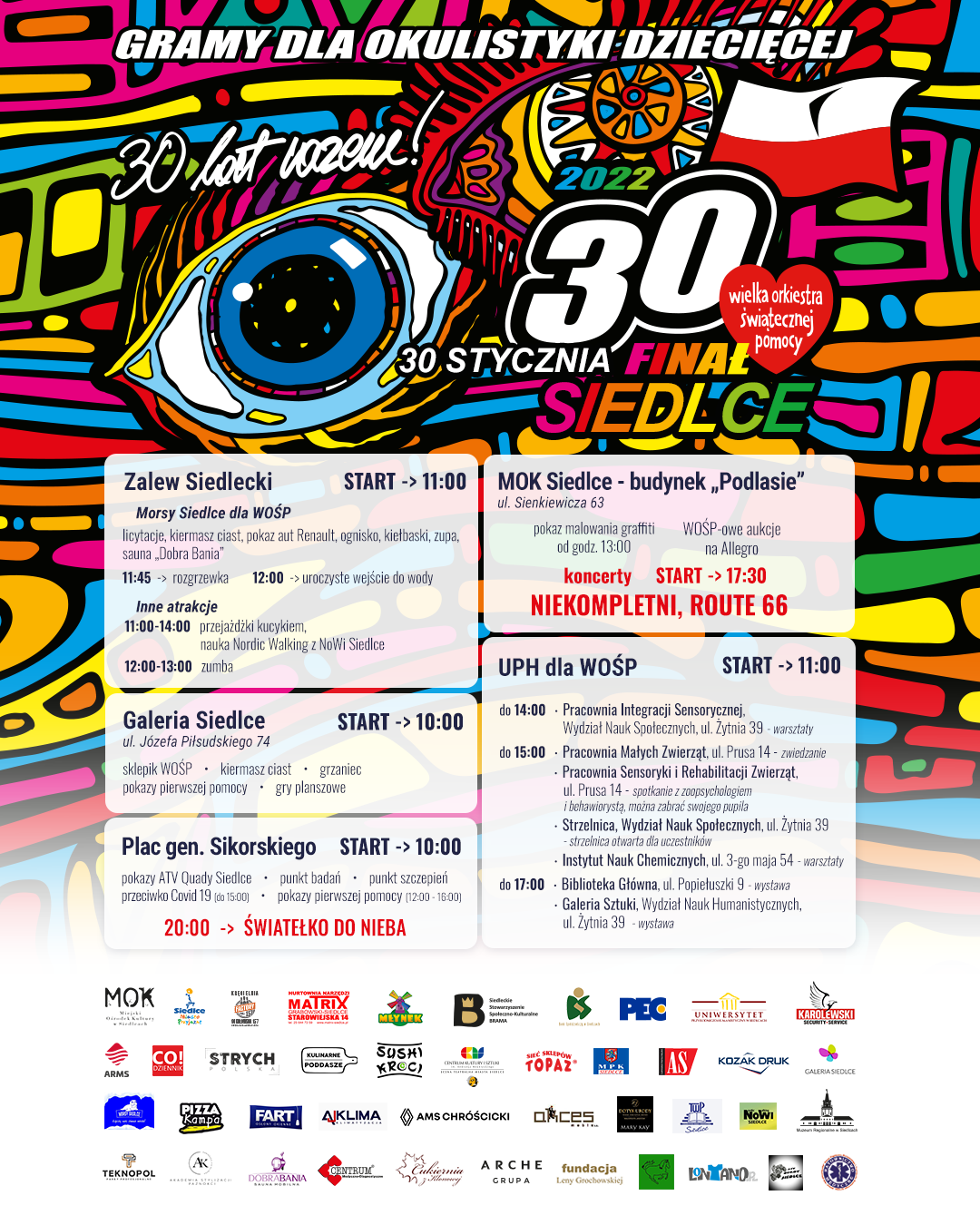 Przed budynkiem „Podlasie”, który tradycyjnie będzie siedzibą siedleckiego Sztabu, od godz. 13:00 odbędzie się pokaz malowania graffiti. O godz. 17:30 zapraszamy na koncerty zespołów Niekompletni i Route 66. Koncerty będzie można zobaczyć na żywo w sali widowiskowej „Podlasie” (za wrzut do puszki), na kanale YouTube Miejskiego Ośrodka Kultury w Siedlcach oraz na Placu gen. Sikorskiego na specjalnym ustawionym telebimie.