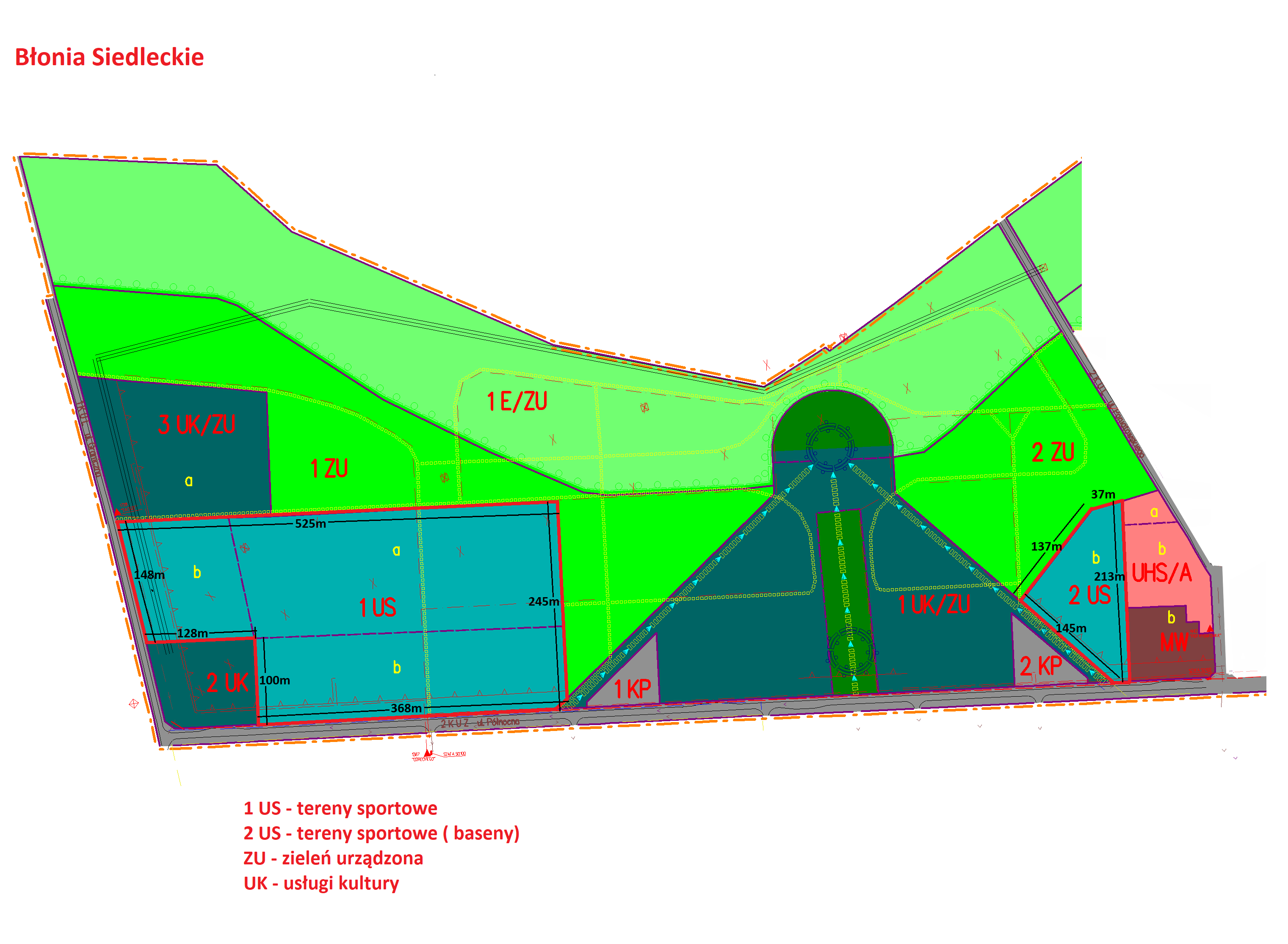 Miejscowy plan zagospodarowania przestrzennego na terenie 1US wskazuje na treny sportowe natomiast 2US na tereny sportowe ze wskazaniem na baseny. Tereny ZU – to tereny zieleni urządzonej – ciągi piesze i rowerowe, ew. mała architektura poza strefą ekologiczną (E/ZU).