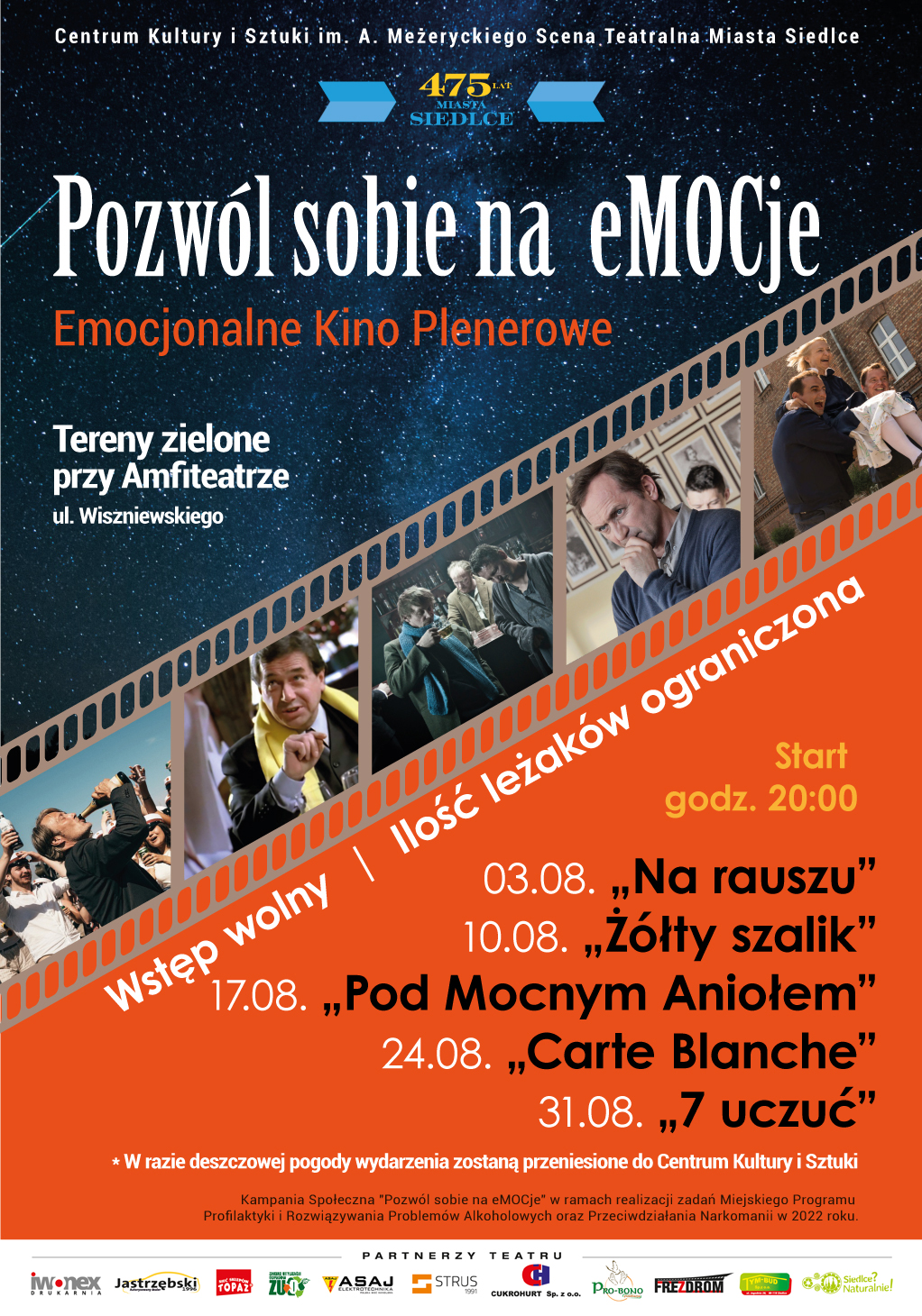 W każdą środę sierpnia o godzinie 20:00 na terenach zielonych przy Amfiteatrze (ul. Wiszniewskiego) w ramach projektu eMOCjonalne Kino Plenerowe będzie można obejrzeć produkcje filmowe niosące pozytywne wzorce, ukazujące pułapki, w które może wpaść każdy z nas, a także angażujące nasze współodczuwanie z tymi, którzy w nie wpadli.