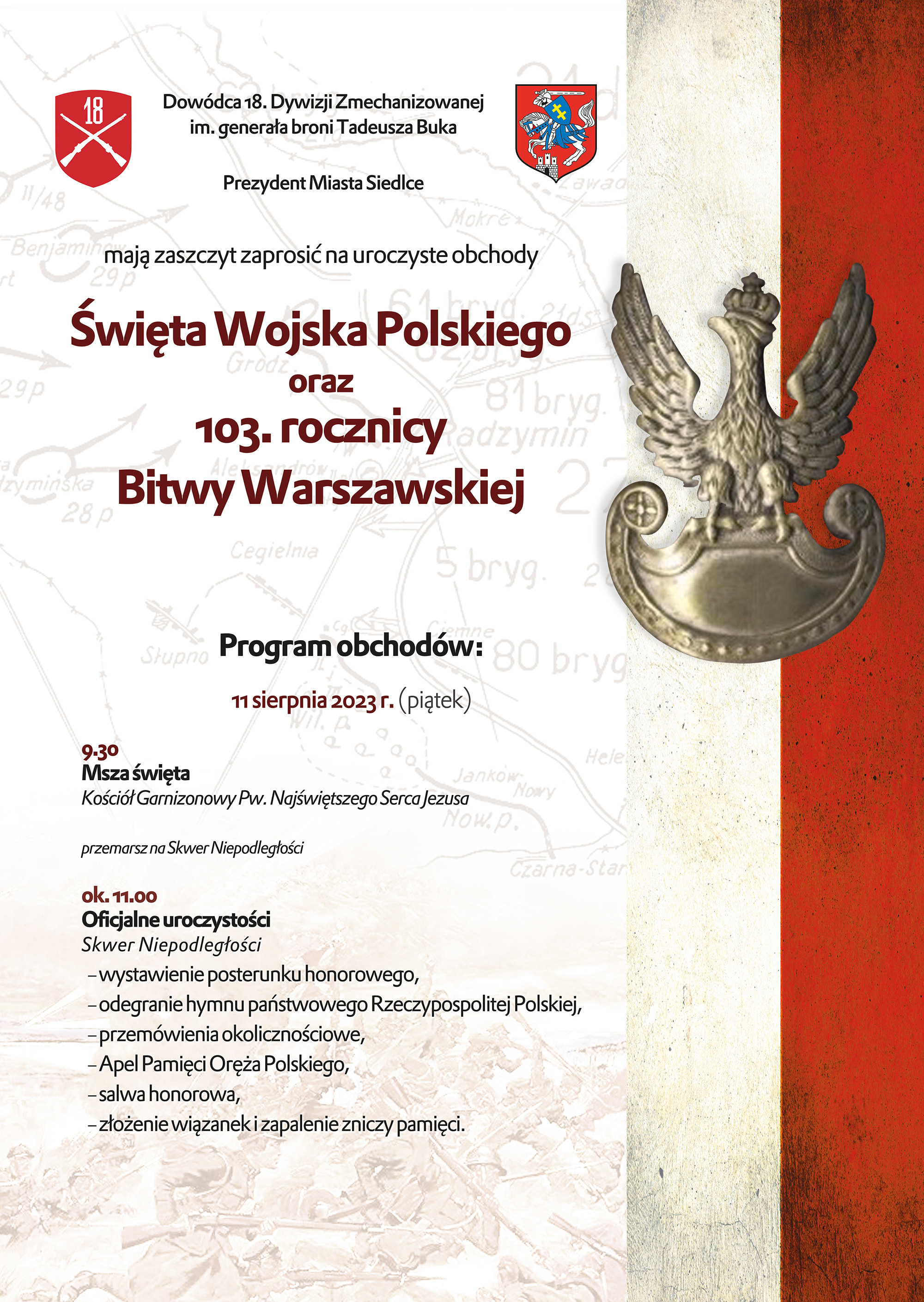 Dowódca 18. Dywizji Zmechanizowanej im. generała broni Tadeusza Buka oraz Prezydent Miasta Siedlce mają zaszczyt zaprosić na uroczyste obchody Święta Wojska Polskiego oraz 103. rocznicy Bitwy Warszawskiej