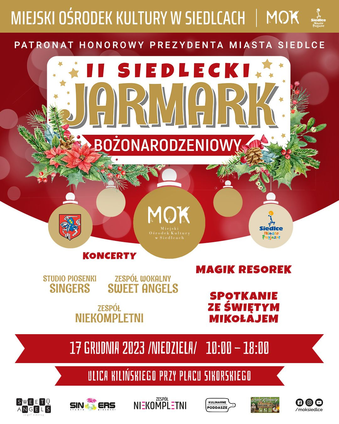 Siedlecki Jarmark Bożonarodzeniowy to wyjątkowa impreza plenerowa. Kilka dni przed wigilią ulica Kilińskiego zmieni się w magiczną, świąteczną promenadę pełną kolorowych świetlnych iluminacji, bujnych choinek i stoisk z wigilijnymi specjałami, zachwycającym rękodziełem, bożonarodzeniowymi dekoracjami, tradycyjnymi wędlinami czy serami, regionalnymi wyrobami oraz pysznymi wypiekami. Nie zabraknie również koncertów i atrakcji dla dzieci.