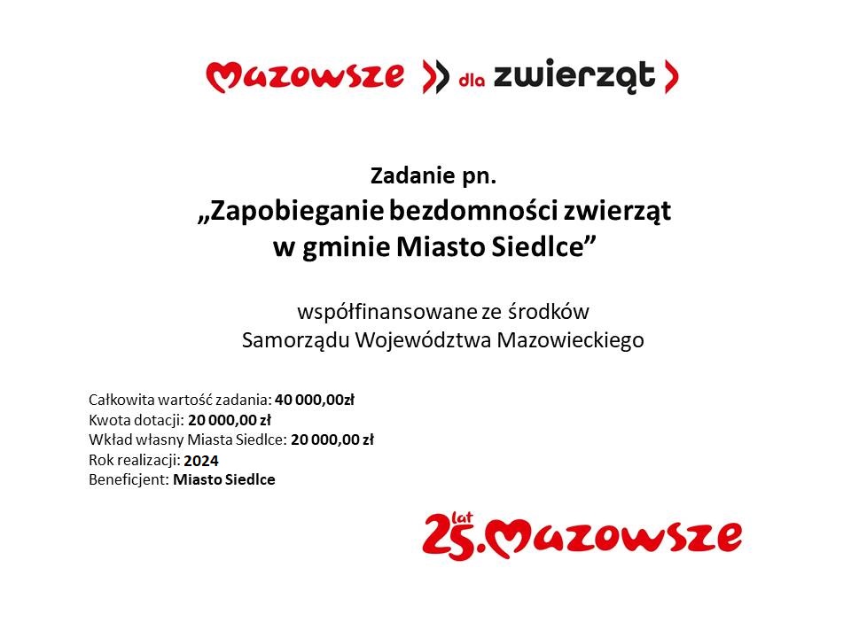 Szanowni Mieszkańcy! Miasto Siedlce pozyskało dofinansowanie w kwocie 20 000,00 zł ze środków Samorządu Województwa Mazowieckiego na realizację zadania pn. Zapobieganie bezdomności zwierząt w gminie Miasto Siedlce w ramach „Mazowieckiego Programu Wsparcia Zapobiegania Bezdomności Zwierząt – Mazowsze dla zwierząt 2024". Całkowita wartość zadania wynosi 40 000,00 zł brutto. W ramach ww. środków finansowych Mieszkańcy Miasta Siedlce będą mieli możliwość skorzystania z bezpłatnego zabiegu weterynaryjnego kastracji lub sterylizacji swoich psów i kotów oraz elektronicznego oznakowania mikroczipem wraz z rejestracją w bazie danych Safe Animal.
