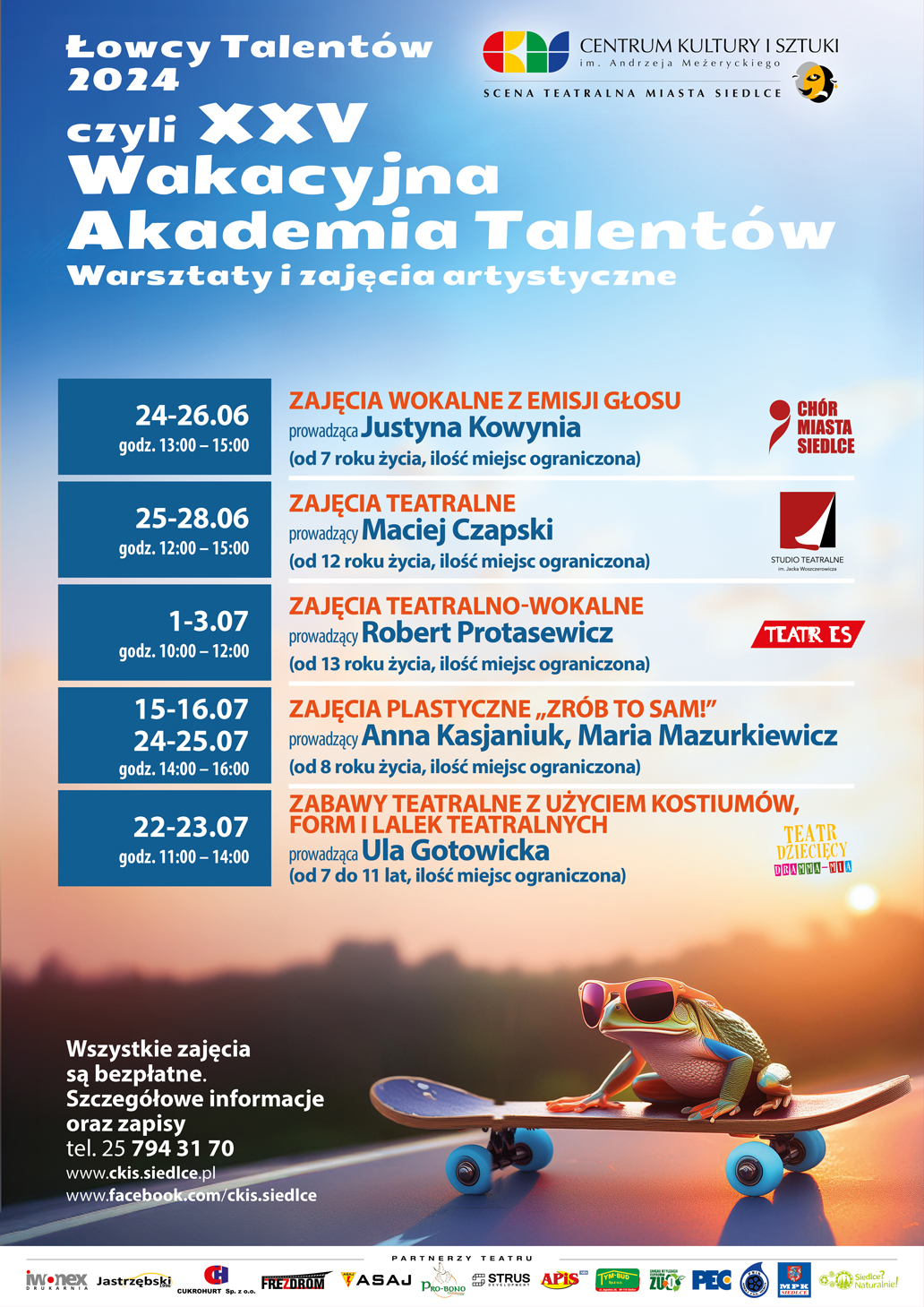 Zachęcamy do zapoznania się z ofertą Centrum Kultury i Sztuki przygotowaną w ramach XXV Wakacyjnej Akademii Talentów. W tym roku zajęcia teatralne, wokalne, muzyczne i plastyczne dla dzieci i młodzieży poprowadzą.: Justyna Kowynia, Maciej Czapski, Ula Gotowicka, Robert Protasewicz, Anna Kasjaniuk i Maria Mazurkiewicz.
