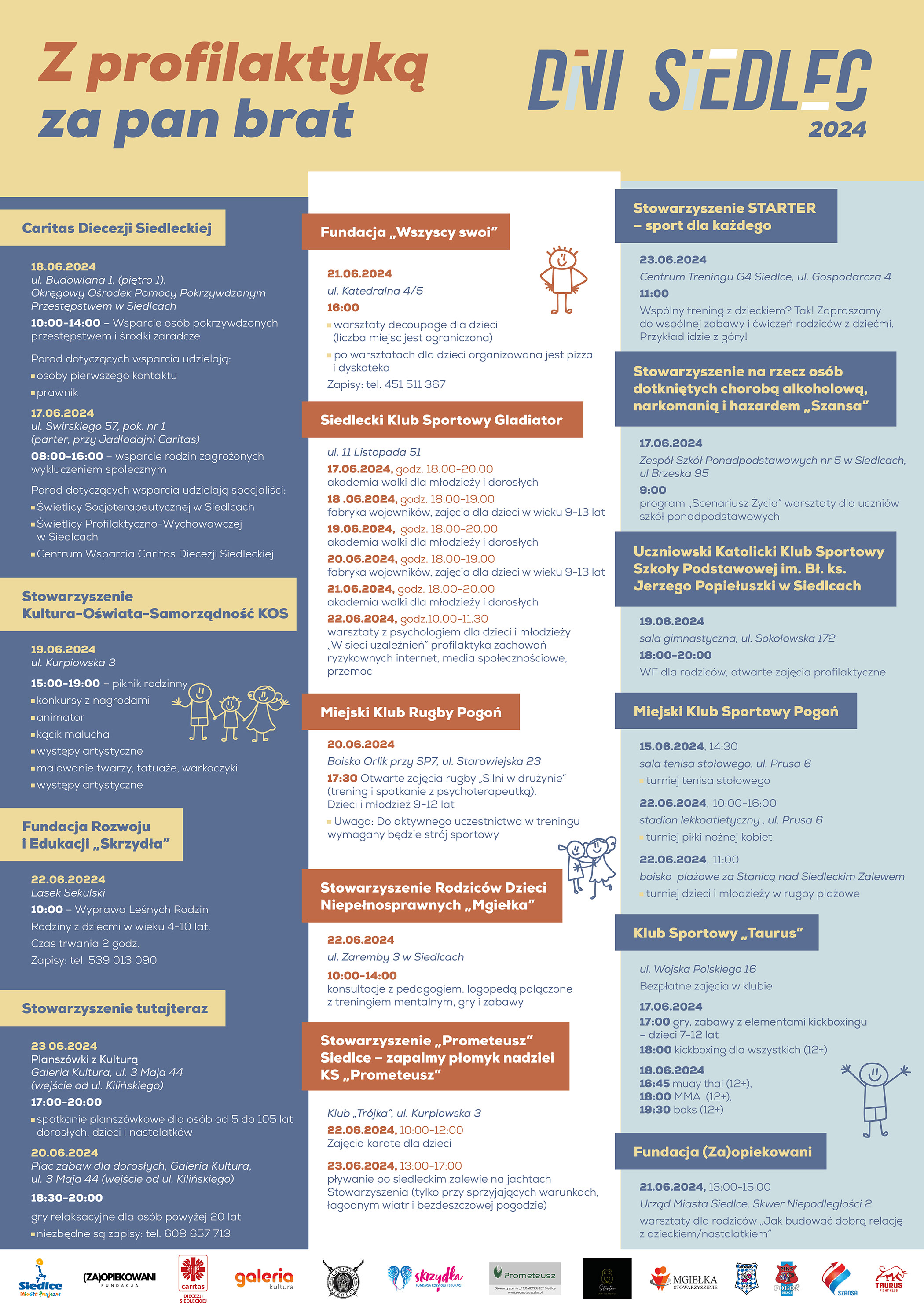 Serdecznie zapraszamy do uczestnictwa w zajęciach organizowanych przez Organizacje Pozarządowe realizujące działania na rzecz profilaktyki. Z profilaktyką za pan brat to druga już edycja działań skierowanych do mieszkańców, zarówno dzieci i młodzieży, jak i ich rodziców w ramach Dni Siedlec 2024.