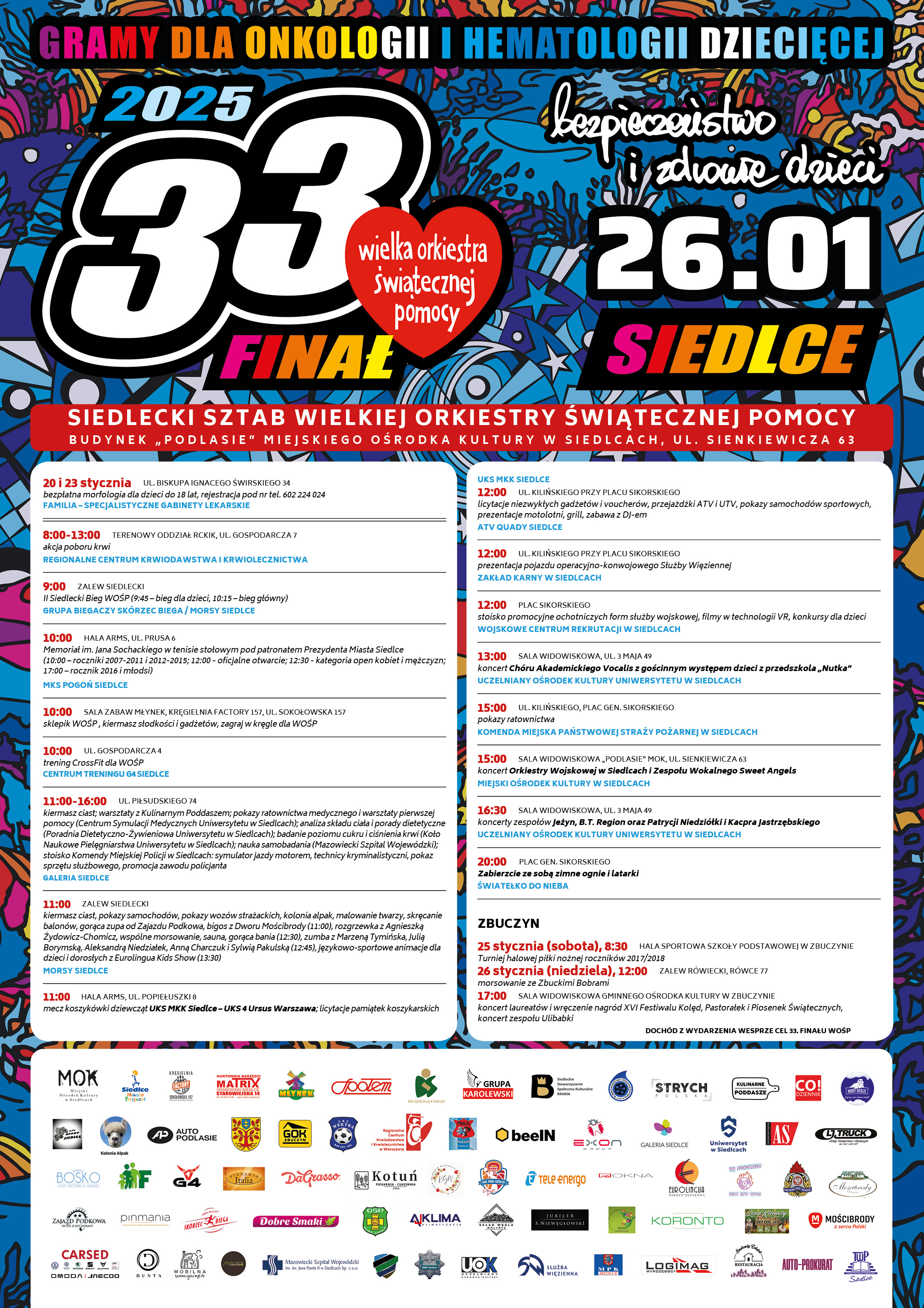 33. Finał Wielkiej Orkiestry Świątecznej Pomocy odbędzie się w niedzielę 26 stycznia 2025 roku. W tym roku gramy dla onkologii i hematologii dziecięcej, a mottem zbiórki jest „Gramy na zdrowie!”.