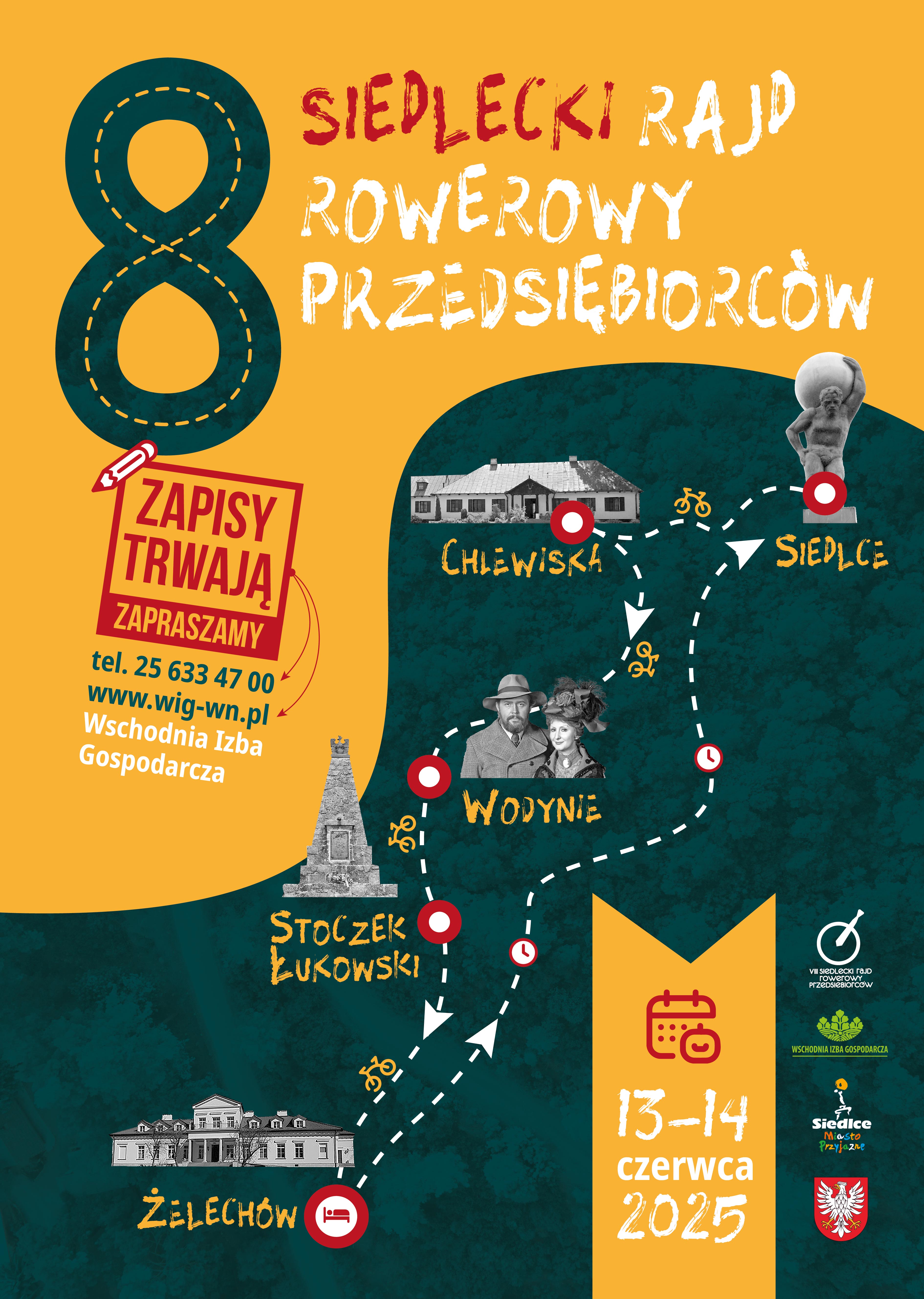 Wschodnia Izba Gospodarcza organizuje w dniach 13-14 czerwca 2025 VIII Rajd Rowerowy Przedsiębiorców. Zapraszamy do udziału wszystkich miłośników rowerowego wypoczynku.