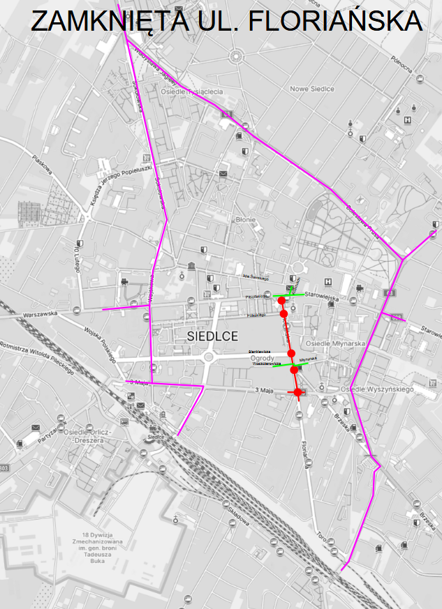 • zamknięciu odcinka ul. Floriańskiej od skrzyżowania z ul. Piłsudskiego do skrzyżowania z ul. 3 Maja (WŁĄCZNIE)
