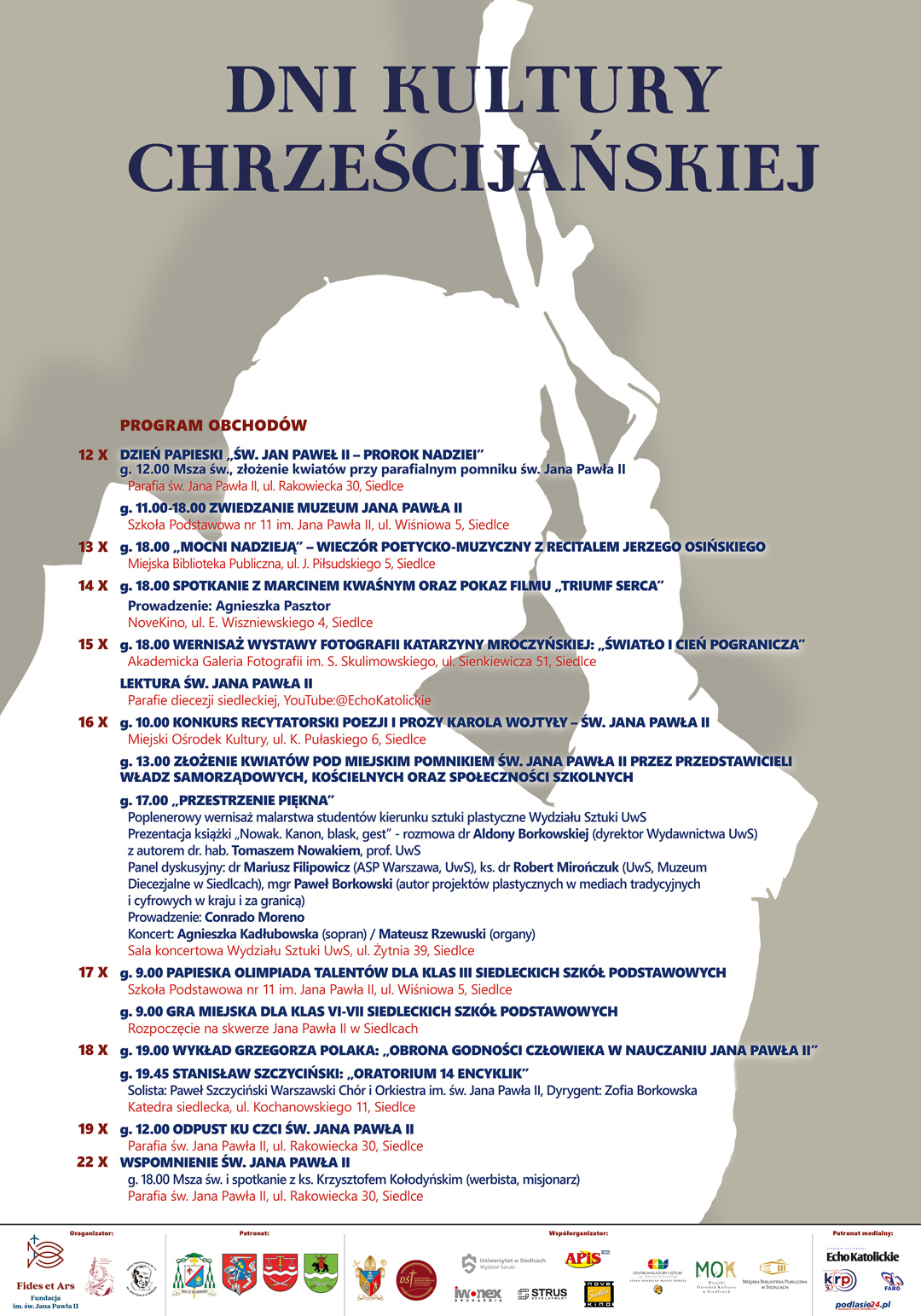 Tegoroczne obchody rozpoczną się 12 października, w Dzień Papieski, który w tym roku będzie przebiegał pod hasłem: „Św. Jan Paweł II – Pielgrzym Nadziei”. Wydarzenia potrwają do 22 października. Centralną postacią i inspiracją programową będzie św. Jan Paweł II – jego życie, myśl i nauczanie. Za organizację odpowiada Fundacja im. św. Jana Pawła II „Fides et Ars”, działająca przy duszpasterstwie środowisk twórczych diecezji siedleckiej, we współpracy z parafią św. Jana Pawła II oraz Szkołą Podstawową nr 11 jego imienia.