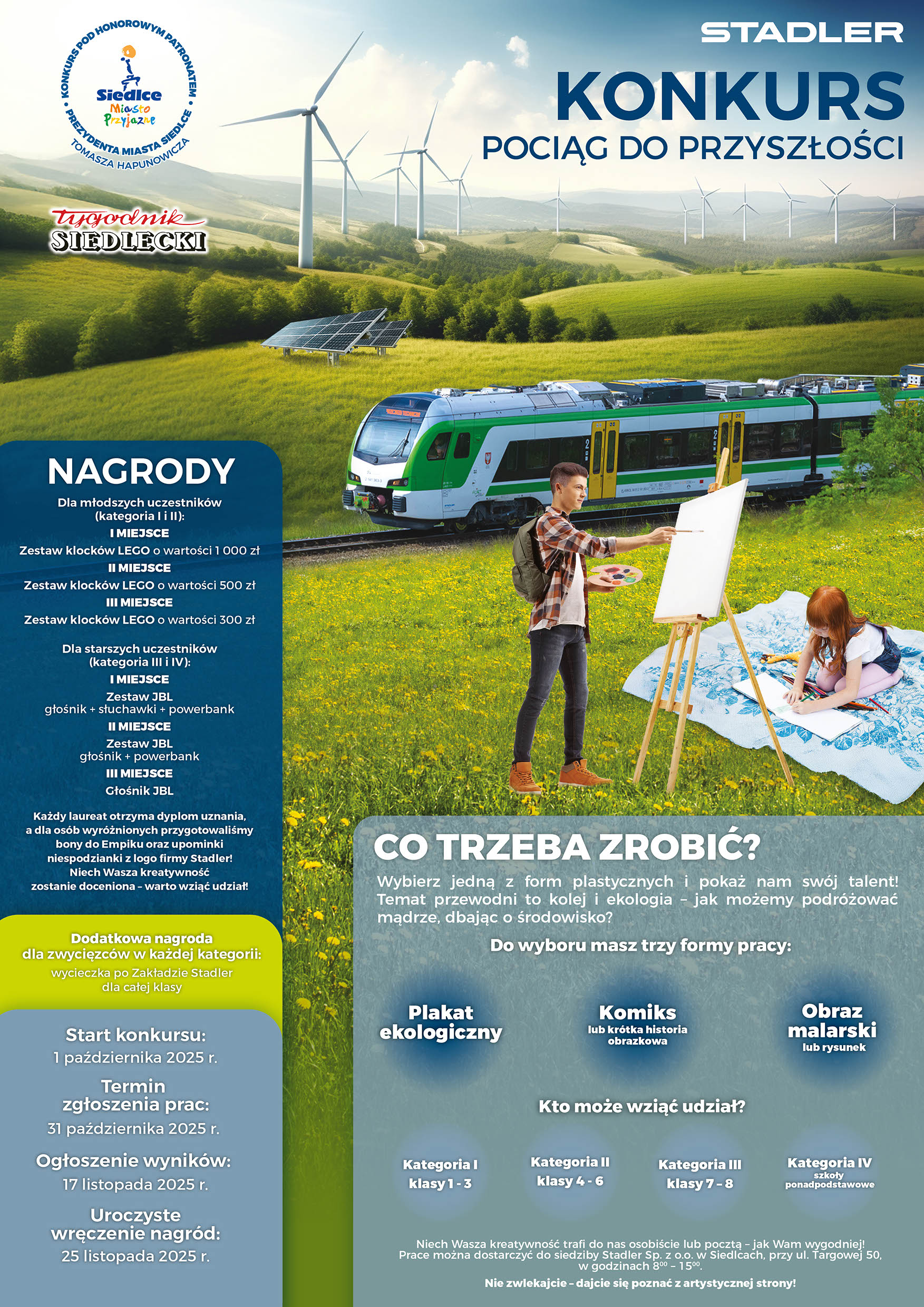 Stadler Polska Sp. z o.o. zaprasza uczniów szkół do udziału w konkursie edukacyjnym „Pociąg do przyszłości”, pod patronatem Prezydenta Miasta Siedlce Tomasza Hapunowicza oraz Tygodnika Siedleckiego.