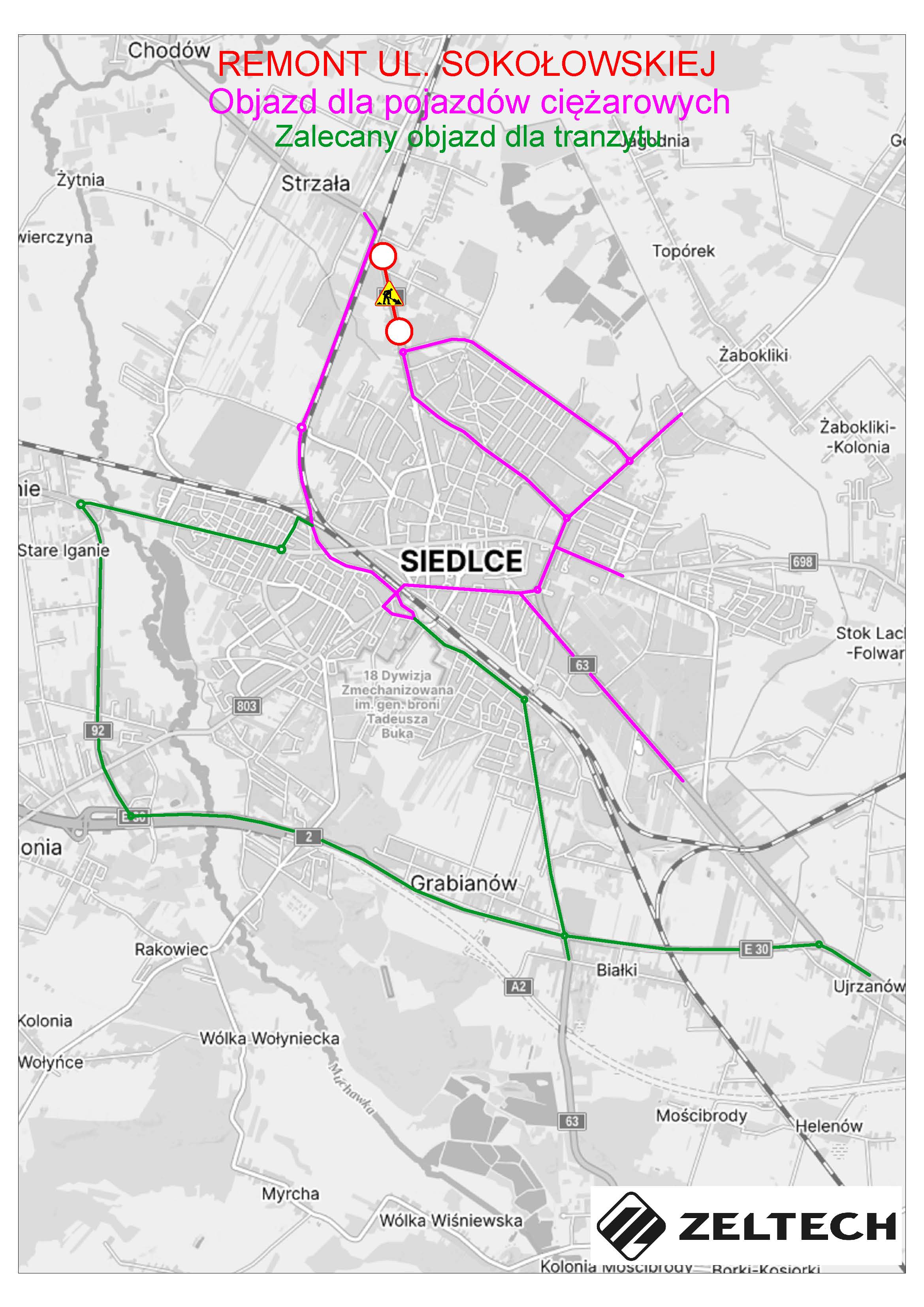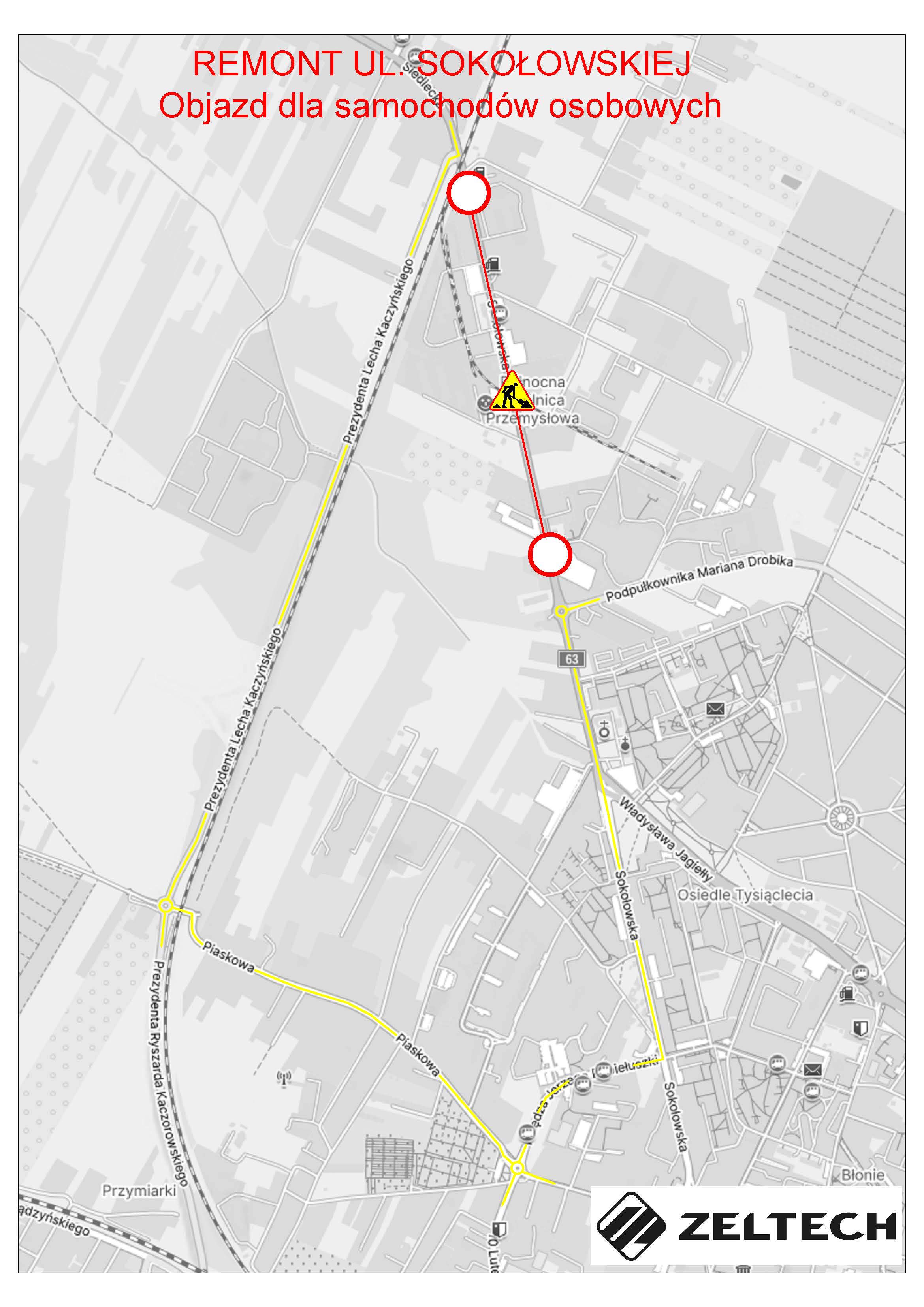 Od 11 października w związku z remontem zostanie zamknięta ul. Sokołowska na odcinku od ronda Kazimierza Deyny do przejazdu kolejowego. Poniżej zamieszczamy mapki objazdów dla samochodów osobowych i ciężarowych.