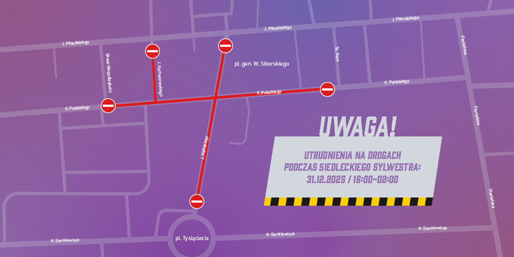 Agencja Rozwoju Miasta Siedlce informuje, że w związku z organizacją Siedleckiego Sylwestra na Placu Sikorskiego wystąpią czasowe utrudnienia w ruchu drogowym.