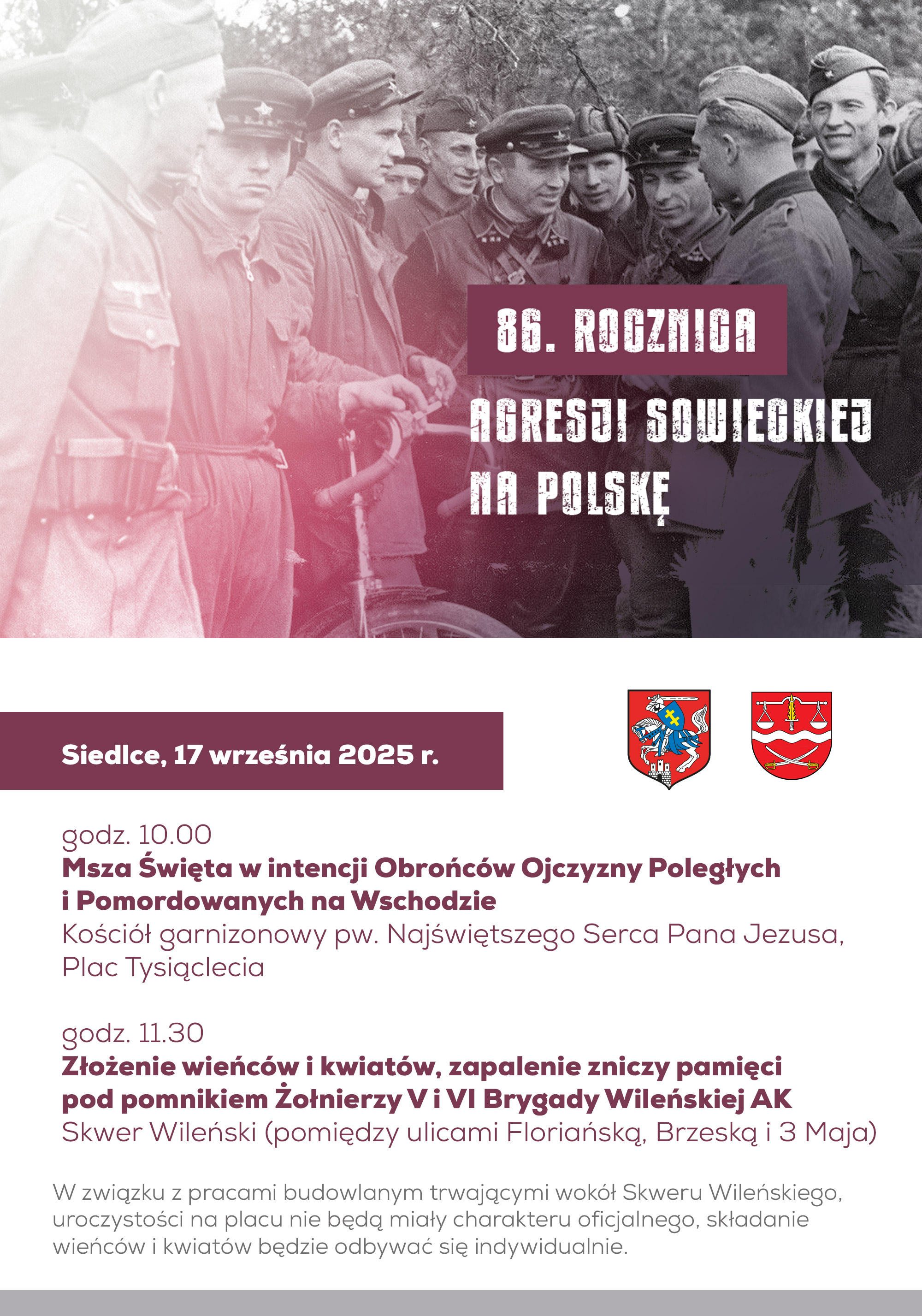 W związku z pracami budowlanym trwającymi wokół Skweru Wileńskiego, uroczystości na placu nie będą miały charakteru oficjalnego, składanie wieńców i kwiatów odbywać się będzie indywidualnie.
