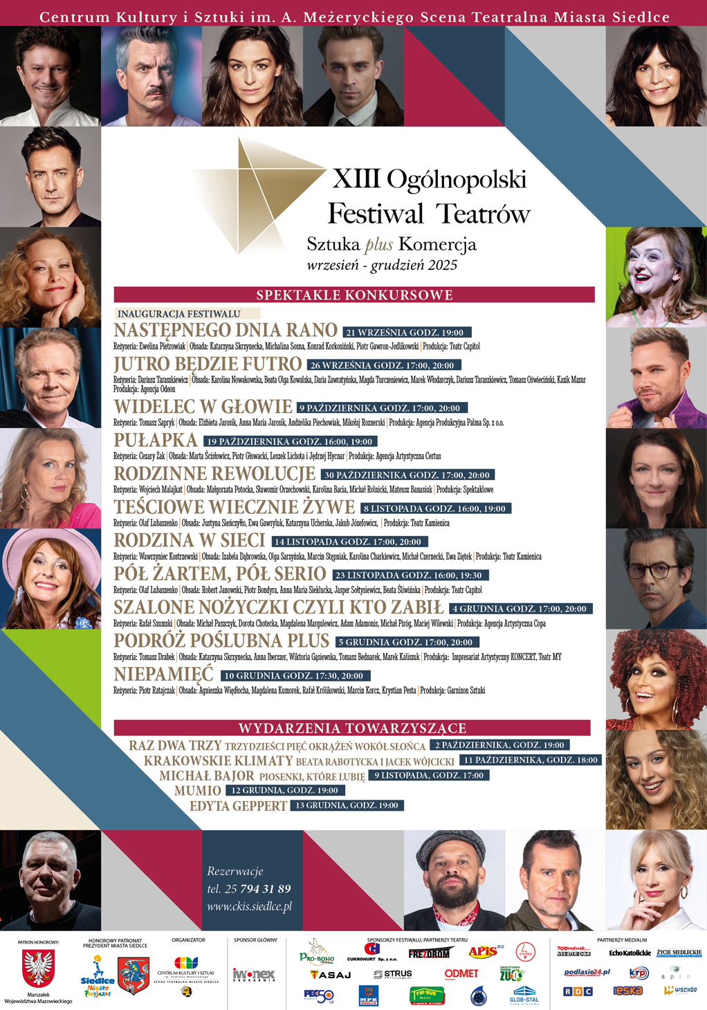Centrum Kultury i Sztuki po raz trzynasty zaprasza na Ogólnopolski Festiwal Teatrów „Sztuka plus Komercja”. Od września do grudnia 2025 roku na Scenie Teatralnej Miasta Siedlce zaprezentowane zostaną najnowsze produkcje teatralne z udziałem uznanych aktorów, reżyserów i muzyków, które spotkały się z entuzjastycznym przyjęciem publiczności w całej Polsce. W tegorocznej edycji festiwalu weźmie udział 11 spektakli konkursowych, takich jak: