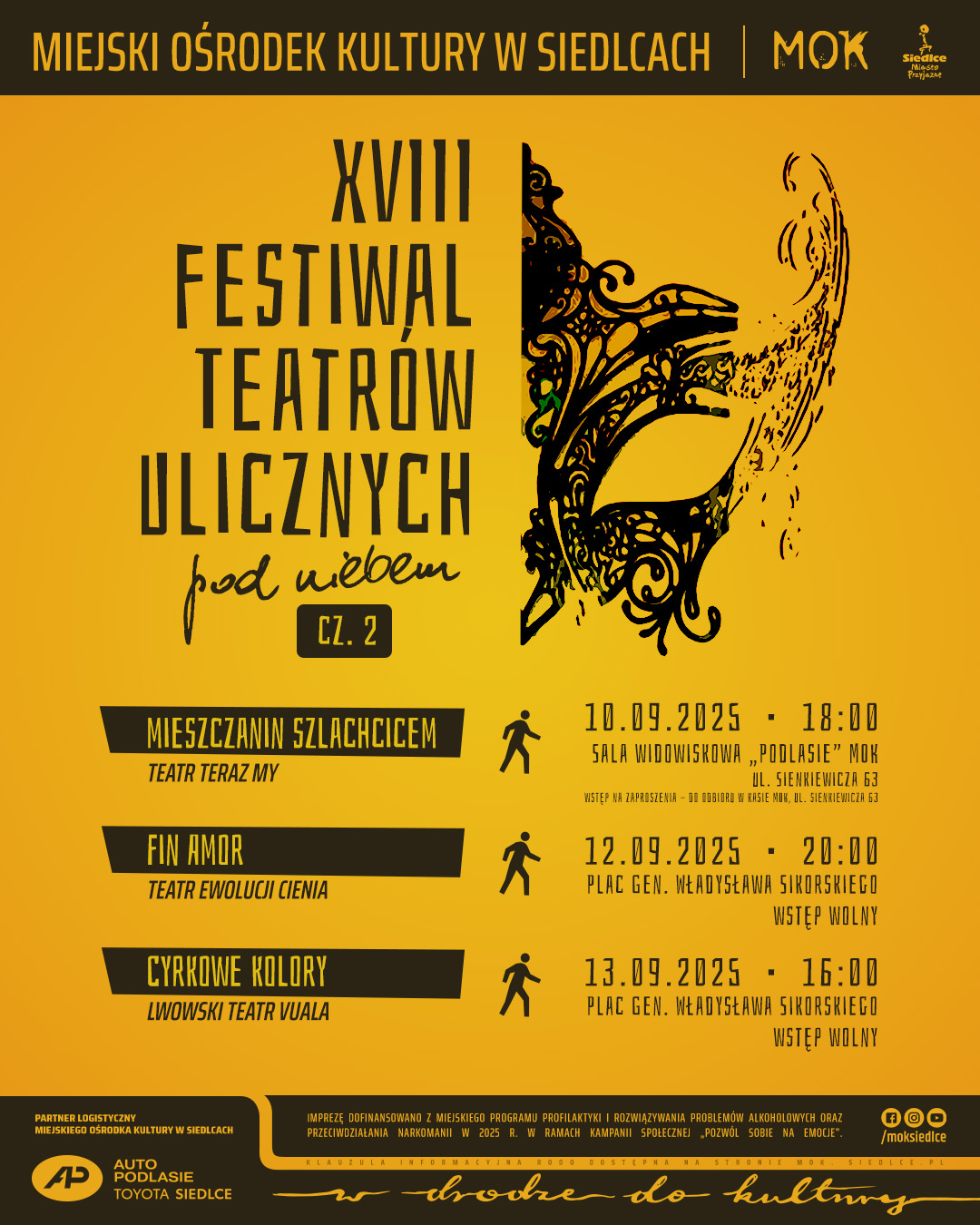 10, 12 i 13 września zapraszamy na II część XVIII Festiwalu Teatrów Ulicznych "pod Niebem". Zobaczymy trzy spektakle: "Mieszczanin szlachcicem" Teatru Teraz My, "Fin Amor" Teatru Ewolucji Cienia i "Cyrkowe kolory" lwowskiego Teatru Vuala.