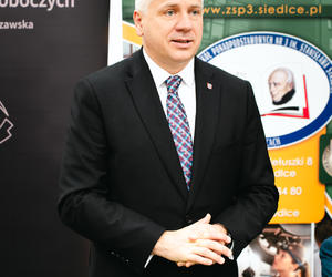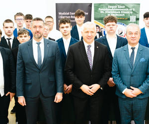 W uroczystości wzięli: Tomasz Hapunowicz – Prezydent Miasta Siedlce, Michał Abramowski – Prodziekan ds. studenckich Wydziału SiMR, Krzysztof Grzegorczuk – Dyrektor ZSP 3 oraz przedstawiciele klas kształcących w zawodach technik mechanik pojazdów samochodowych oraz technik elektromobilności, do których dedykowany jest ten projekt.