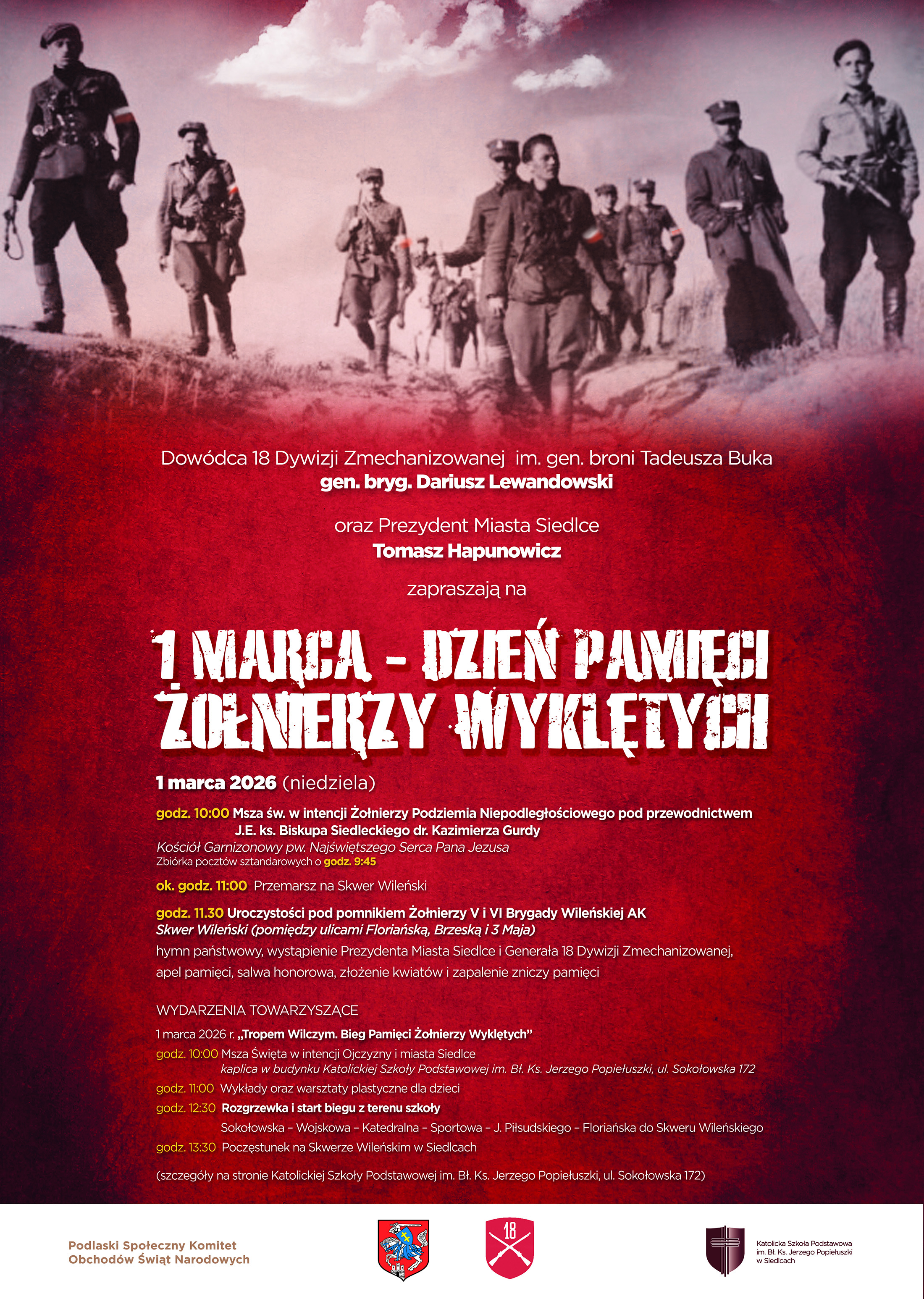 Dowódca 18. Dywizji Zmechanizowanej im. gen. broni Tadeusza Buka gen. bryg. Dariusz Lewandowski oraz Prezydent Miasta Siedlce Tomasz Hapunowicz zapraszają na Narodowy Dzień Pamięci Żołnierzy Wyklętych.