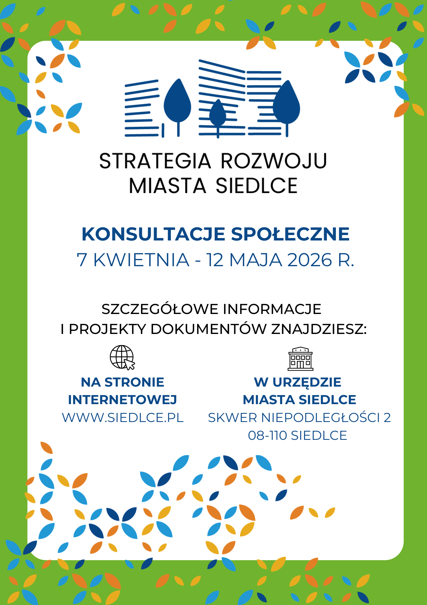 Zapraszamy mieszkańców miasta, lokalnych partnerów społeczno-gospodarczych oraz zainteresowane instytucje/organizacje do składania uwag do projektu Strategii Rozwoju Miasta Siedlce na lata 2025-2035 w ramach konsultacji społecznych projektu dokumentu pod nazwą: Strategia Rozwoju Miasta Siedlce na lata 2025-2035