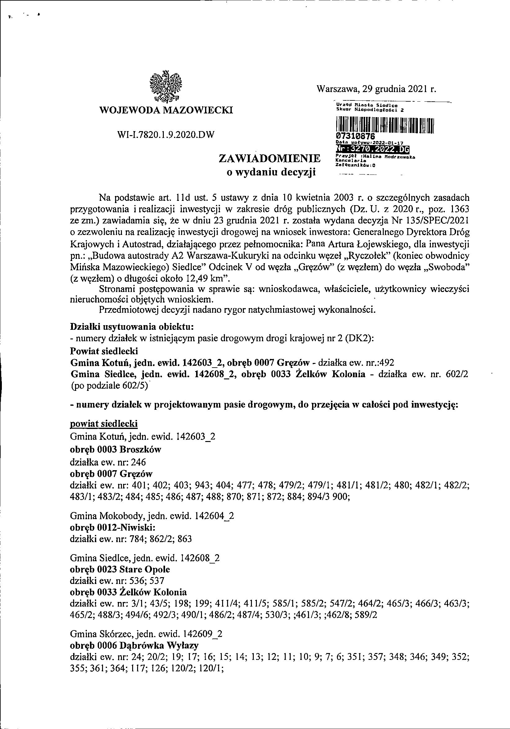 Zawiadomienie o wydaniu dezycji Nr 135/SPEC/2021 o zezwoleniu na realizację inwestycji drogowej ma wniosek Inwestora" Generalnego Dyrektora Dróg Krajowych i Autostrad, dla inwestycji pn.: "Budowa autostarady A2 Warszawa-Kukuryki na odcinku węzeł "Ryczołek" (koniec obwodonicy Mińska Mazowieckiego) Siedlce" Odcinek V od węzła "Gręzów" (z węzłem) do węzła "Swoboda" (z węzłem) o długości o koło 12,49 km