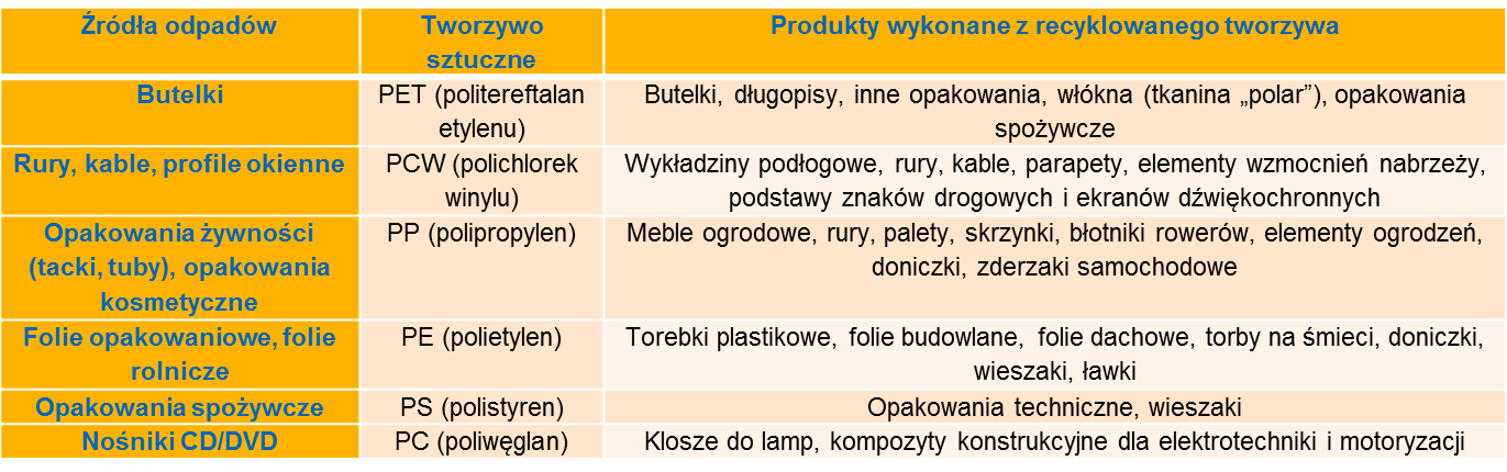 Odpady tworzyw sztucznych to cenny surowiec wtórny do recyklingu, z którego można wytworzyć nowe produkty (opakowania, meble ogrodowe, doniczki, słupki parkingowe itp.). Poprzez spalanie odpadów plastikowych w piecach domowych pozbawiamy się tych wartościowych surowców i zanieczyszczamy środowisko, w którym żyjemy.