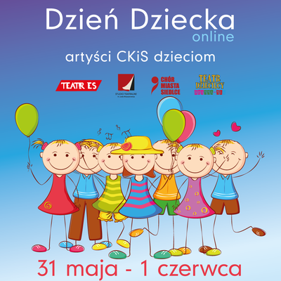 W dniach 31 maja - 1 czerwca zapraszamy Państwa na Dzień Dziecka online z artystami CKiS. Specjalny program z okazji święta wszystkich dzieci przygotowali artyści Teatru Es, Chóru Miasta Siedlce, Studia Teatralnego im. J. Woszczerowicza oraz Teatru Dziecięcego Dramma-Mia.