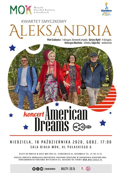Podczas koncertu, na który Miejski Ośrodek Kultury w Siedlcach zaprasza 18 października do Sali Białej, Kwartet Smyczkowy Aleksandria zaprezentuje utwory oparte na tradycyjnej muzyce Stanów Zjednoczonych, czyli country czy blue grass. Nie zabraknie znanych standardów musicalowych, piosenek Georga Gershwina i hitów filmowych. Do tej mieszanki dodamy garść muzyki irlandzkiej i angielskiej, która przecież ma swoje miejsce w „amerykańskim tyglu”.