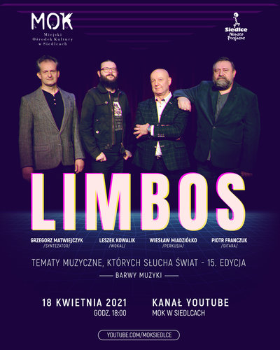 Miejski Ośrodek Kultury w Siedlcach zaprasza na koncert online Grupy Muzycznej Limbos pt. „Barwy Muzyki”. To kolejny, piętnasty już, program z cyklu „Tematy muzyczne, których słucha świat”. Grupa Muzyczna Limbos w instrumentalnych wersjachzaprezentuje bardzo znane fragmenty z muzyki dawnej (klasycznej) oraz wybrane piosenki z muzyki popularnej, których chętnie słucha Polska i świat.
