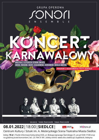 Karnawałowa podróż muzyczna północ-południe, wschód-zachód to przebojowy program muzyki operowej i klasycznej z różnych stron świata! W programie koncertu spotkają się cztery różne żywioły muzyczne. Zapraszamy na mroźną, surową północ Europy, odmalowaną w skandynawskiej muzyce scenicznej Edvarda Griega i tradycyjnej fińskiej "Polki Ewy"!. Wprost z północy przeniesiemy Państwa na gorące, żywiołowe, pulsujące tanecznymi rytmami południe Europy. Złote lata włoskiego bel canta przypomną komediowe, żartobliwe sceny z oper Gioacchino Rossiniego ("Kopciuszek"), zaś nieposkromiony hiszpański charakter zagości w scenach z opery "Carmen" Georgesa Bizeta. Drugą część koncertu wypełni konfrontacja nasyconej uczuciowością muzyki rosyjskiej z przebojowym amerykańskim, rewiowym show prosto z Broadway'u. Usłyszą Państwo sceny zbiorowe z oper Aleksandra Borodina ("Tańce połowieckie" z opery "Kniaź Igor"), Piotra Czajkowskiego (scena na balu z opery "Eugeniusz Oniegin") i Sergiusza Rachmaninowa (chór z opery "Aleko"), a na finał standardy jazzowe George'a Gershwina oraz ulubione przeboje amerykańskie. Ten wyjątkowy wieczór spędzą Państwo w towarzystwie sześciu śpiewaków operowych, znakomitych solistów z Pragi, Krakowa i Wrocławia.