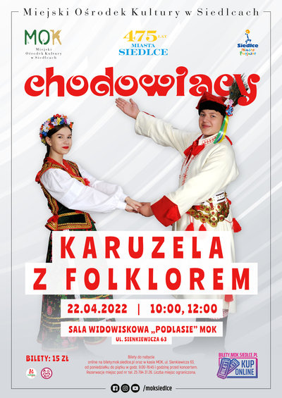 W ramach cykluedukacyjnego „Spotkania z folklorem”, skierowanego do uczniów szkół i przedszkoli,Zespół Pieśni i Tańca Ziemi Siedleckiej „Chodowiacy” im. Alicji Siwkiewicz zaprasza na pokaz polskich tańców narodowych i regionalnych, przeplatanych pieśniami ludowymi i krótkimi wtrąceniami informacyjnymi. Wprogramie znajdą się dawno niepokazywane: polonez kontuszowy, krakowiak oraz suita szamotulska i biłgorajska, oczywiście w charakterystycznych dla regionu strojach. Ze względu na swój ciekawy, nietypowy wygląd, ubrania z Biłgoraja zasługują na szczególną uwagę. Suita szamotulska i krakowskato najnowsze opracowania znajdujące się w repertuarze „Chodowiaków”. Zawierają warte poznania elementy charakterystyczne dla folkloru ziem zachodnich i Małopolski.