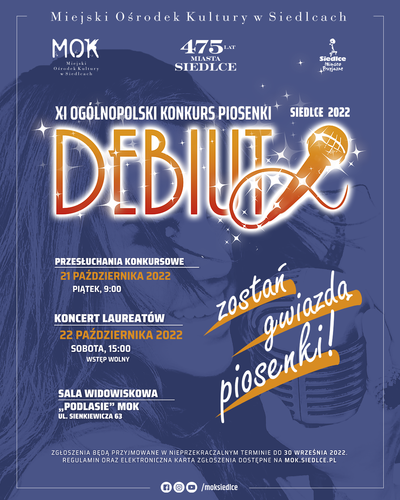 Szczegółowy regulamin i elektroniczna karta zgłoszenia dostępne na stronie mok.siedlce.pl w zakładce KONKURSY → Ogólnopolski Konkurs Piosenki „Debiut”. Na zgłoszenia czekamy do 30 września!