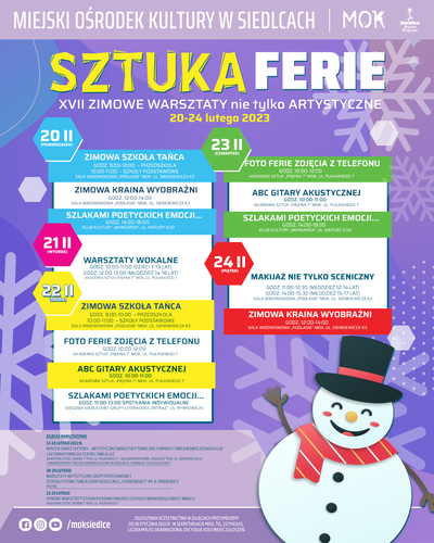 SZTUKAferie, czyli XVII zimowe warsztaty nie tylko artystyczne to zajęcia z różnych dziedzin sztuki, adresowane do dzieci i młodzieży pozostających podczas ferii zimowych w mieście. Warsztaty będą nie tylko sposobem na dobrą zabawę, ale przede wszystkim możliwością kreatywnego i twórczego rozwoju. Aktywna forma zajęć umożliwi rozwój zainteresowań i talentów, które niejednokrotnie zostają tu odkryte. Praca pod kierunkiem doświadczonych instruktorów i artystów często owocuje ciekawymi pracami młodych adeptów sztuki.