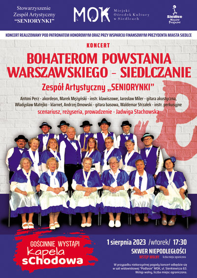 W 79. rocznicę wybuchu Powstania Warszawskiego zapraszamy na koncert Zespołu Artystycznego Seniorynki poświęcony bohaterom Powstania, także tym pochodzącym z Siedlec. W programie znajdą się piosenki z tego okresu oraz wiersze poetów – uczestników tamtych wydarzeń.