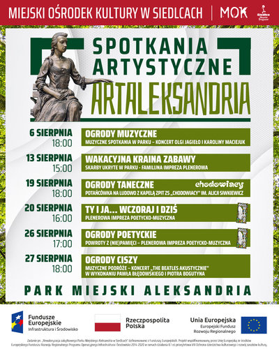 Zadanie pn. "Rewaloryzacja zabytkowego Parku Miejskiego Aleksandria w Siedlcach". Projekt współfinansowany przez Unię Europejską ze środków Europejskiego Funduszu Rozwoju Regionalnego Programu Operacyjnego Infrastruktura i Środowisko 2014-2020 w ramach działania 8.1 oś priorytetowa VIII Ochrona dziedzictwa kulturowego i rozwój zasobów kultury.