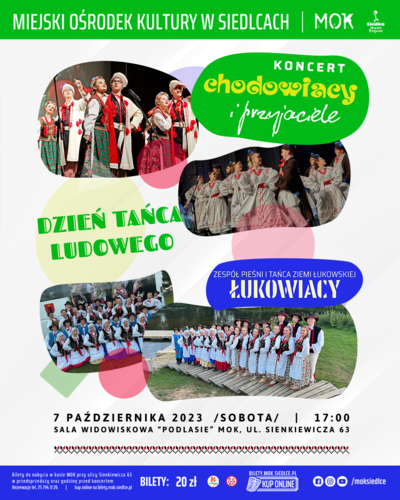 Koncertem „Chodowiacy i Przyjaciele” pragniemy zwrócić uwagę na Dzień Tańca Ludowego, który obchodzimy 7 października. Na naszej scenie zaprezentują się dwa zespoły: Zespół Pieśni i Tańca Ziemi Siedleckiej „Chodowiacy” im. Alicji Siwkiewicz oraz ich przyjaciele Zespół Pieśni i Tańca Ziemi Łukowskiej „Łukowiacy”. Jest to już druga taka, zainicjowana przez „Chodowiaków” integracja i wymiana artystyczna, bowiem rok temu gościliśmy Zespół Tańca Ludowego „Włodawiacy”.