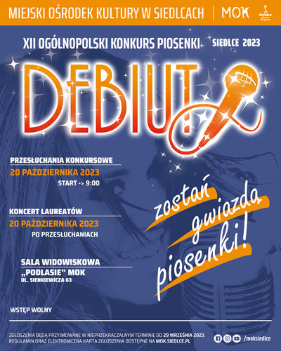 Szczegółowy regulamin i elektroniczna karta zgłoszenia dostępne na stronie mok.siedlce.pl w zakładce KONKURSY → Ogólnopolski Konkurs Piosenki „Debiut”. Na zgłoszenia czekamy do 29 września!