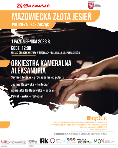 Serdecznie zapraszamy na cykl koncertów muzyki polskiej „Mazowiecka Złota Jesień – Poloneza czas zacząć”, który odbędzie się w dniach 29 września – 1 października. Podczas koncertów wystąpi Orkiestra Kameralna Aleksandria wraz z solistami: Joanną Różewską – fortepian, Agnieszką Kadłubowską – sopran, Pawłem Pawlikiem – fortepian. Prowadzenie od pulpitu – Szymon Telecki.