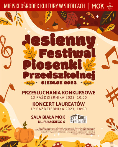 Jesienny Festiwal Piosenki Przedszkolnej organizowany jest z myślą o dzieciach z przedszkoli publicznych i niepublicznych w Siedlcach i powiecie siedleckim. Głównym założeniem Festiwalu jest popularyzacja dorobku artystycznego młodych twórców, wspieranie ich twórczości artystycznej oraz rozwijanie zdolności wokalnych. Usłyszymy utwory pełne uśmiechu i jesiennych promieni słonecznych, które pokażą zgromadzonej publiczności, że jesień wcale nie musi być szara.