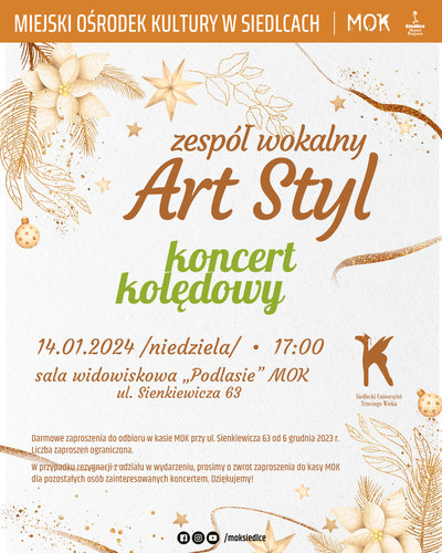 Podczas koncertu, w wykonaniu Zespołu Wokalnego Art Styl, usłyszymy najpiękniejsze polskie kolędy i pastorałki.